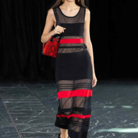 Several looks featured touches borrowed from the boudoir; gossamer-light column dresses with lace inserts and slips with an overlay of lacework replaced ballgowns. Even the stateliest gowns were offered in gauzy fabrics whose ruffles fluttered as models made their way down that Olympic track.