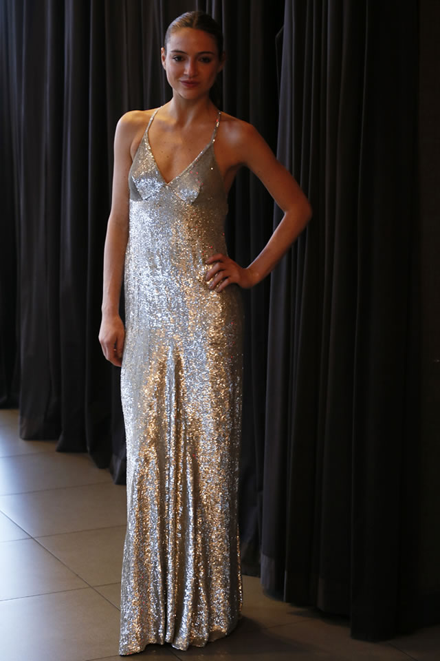 Alice Temperley channeled her boho English country girl again for her spring bridal collection, but also added a bit of decadence and glamour to the looks “dresses to dance all night in,” as the press notes said with Art Deco-inspired crystal embroidery and diaphanous silks providing for lots of movement. There were plenty of Temperley’s signature romantic touches, like vintage scalloped lace and crochet-embroidered bodices. For the bride who likes to party, a slender spaghetti strap gown covered in silver sequins with a low-cut back and a matching cropped bolero that could be tied at the waist conveyed an effortless sexiness.