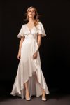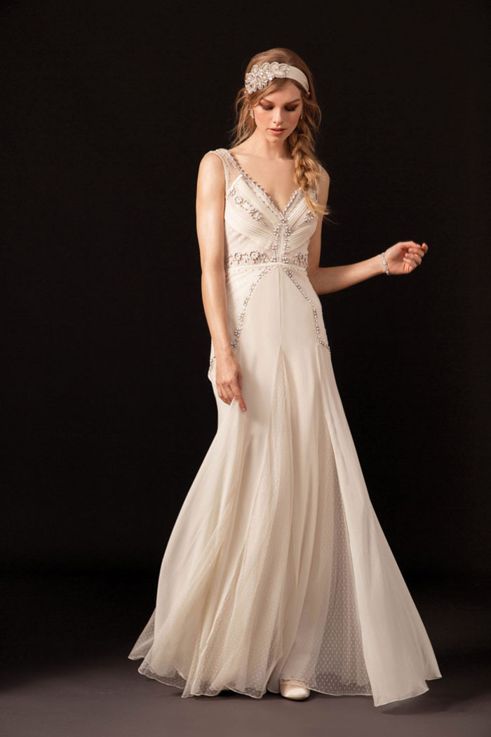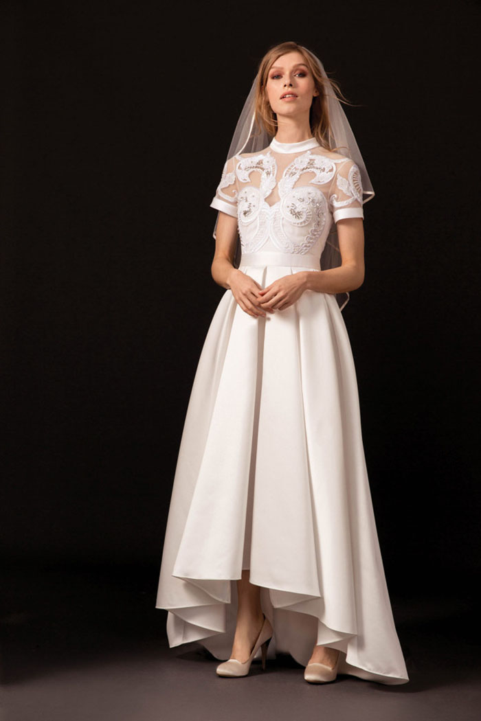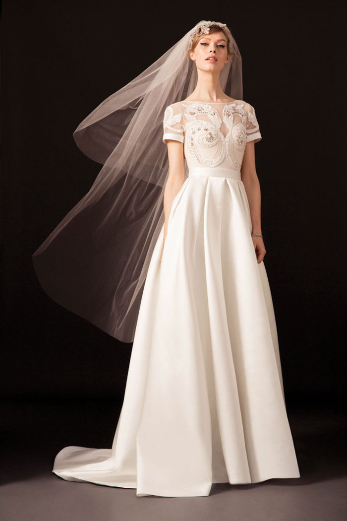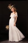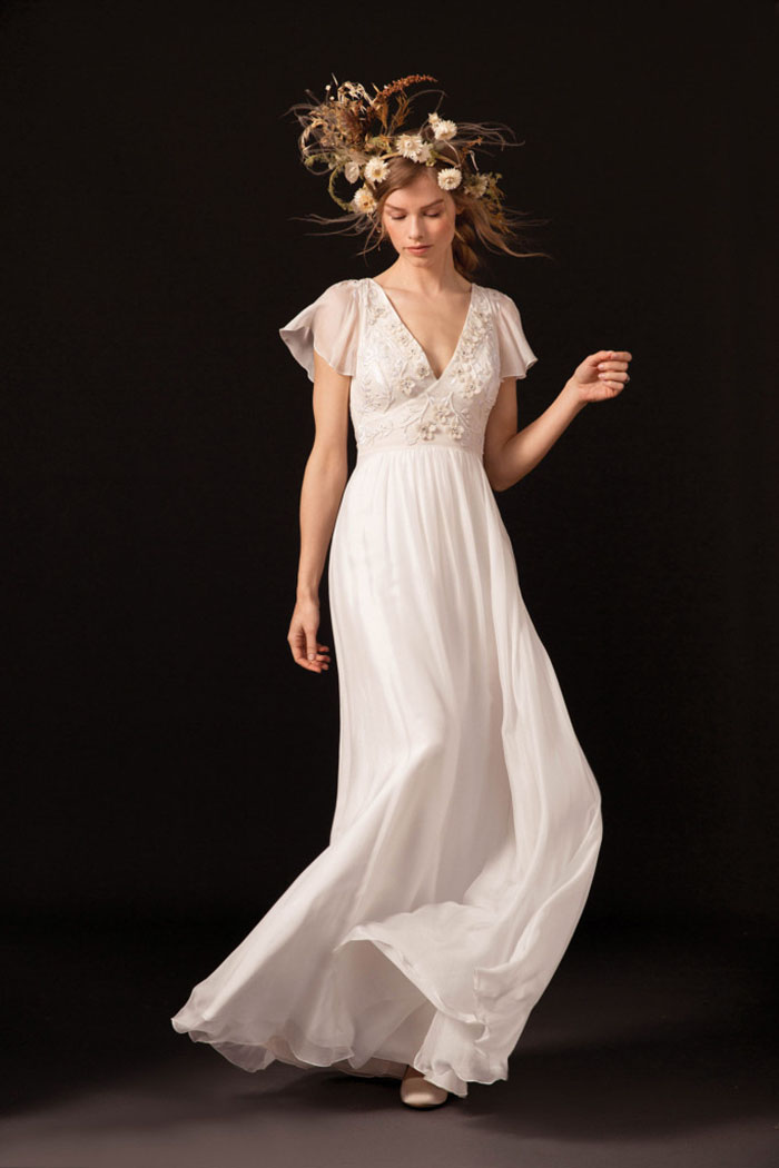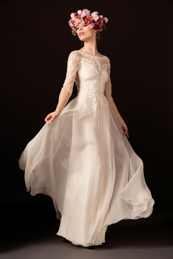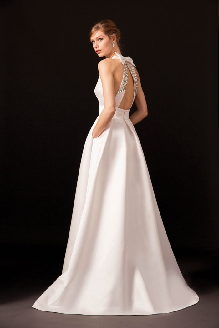 Temperley’s bridal is for the bride with a sense of individualism. For spring, art nouveau artwork and classic Fifties couture were referenced, resulting in a vintage hollywood glamour vibe. Silhouettes varied from bias-cut ruffled panels embellished with crystal waistbands, to structured halter and backless cuts. On a more bohemian note, the collection included flared sleeved and fitted bodice styles.
