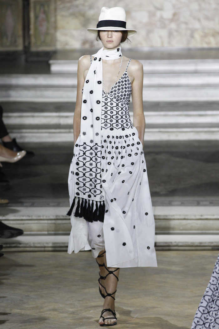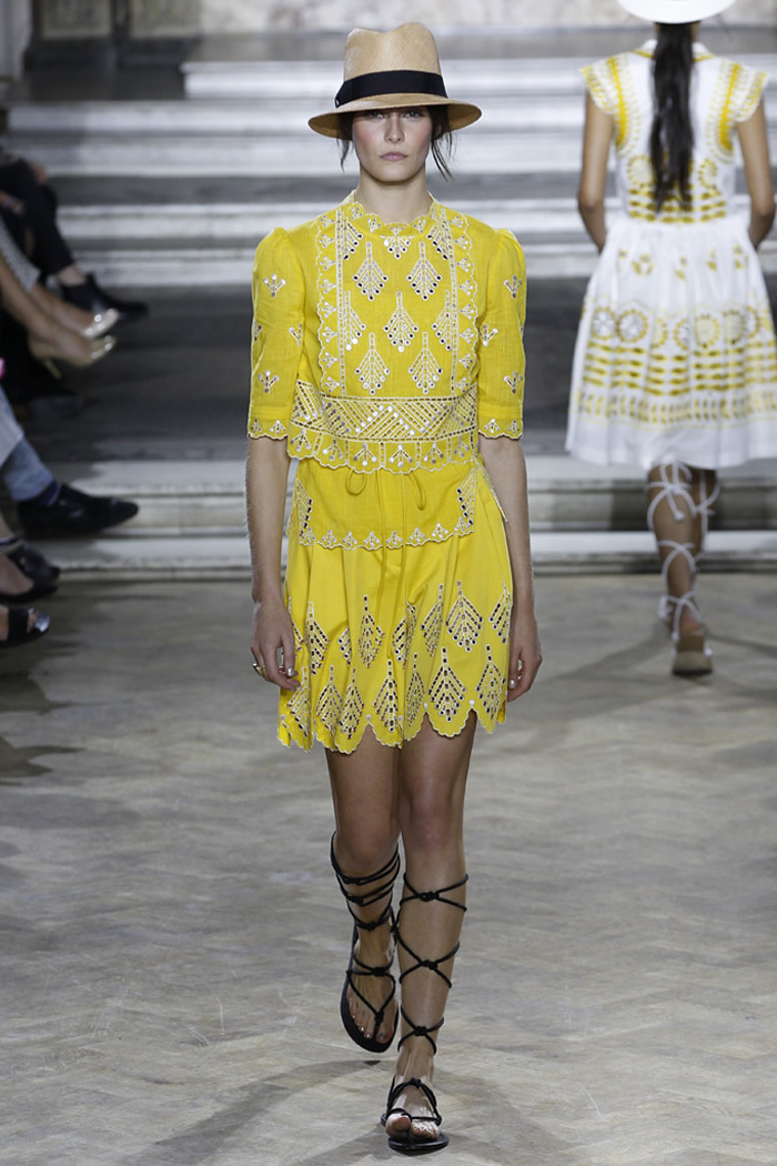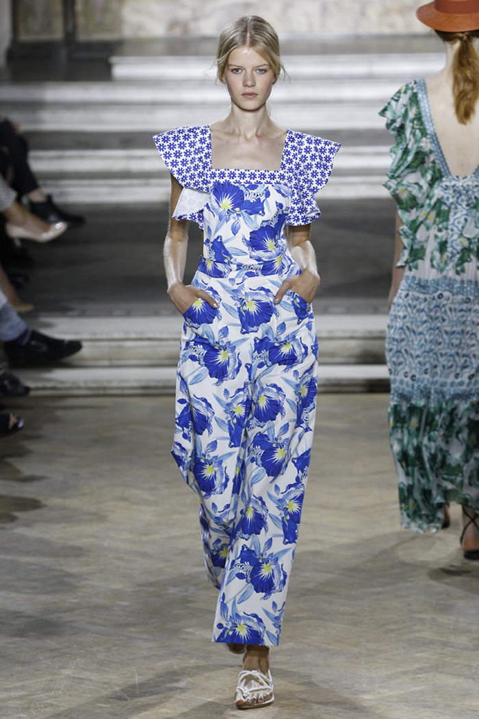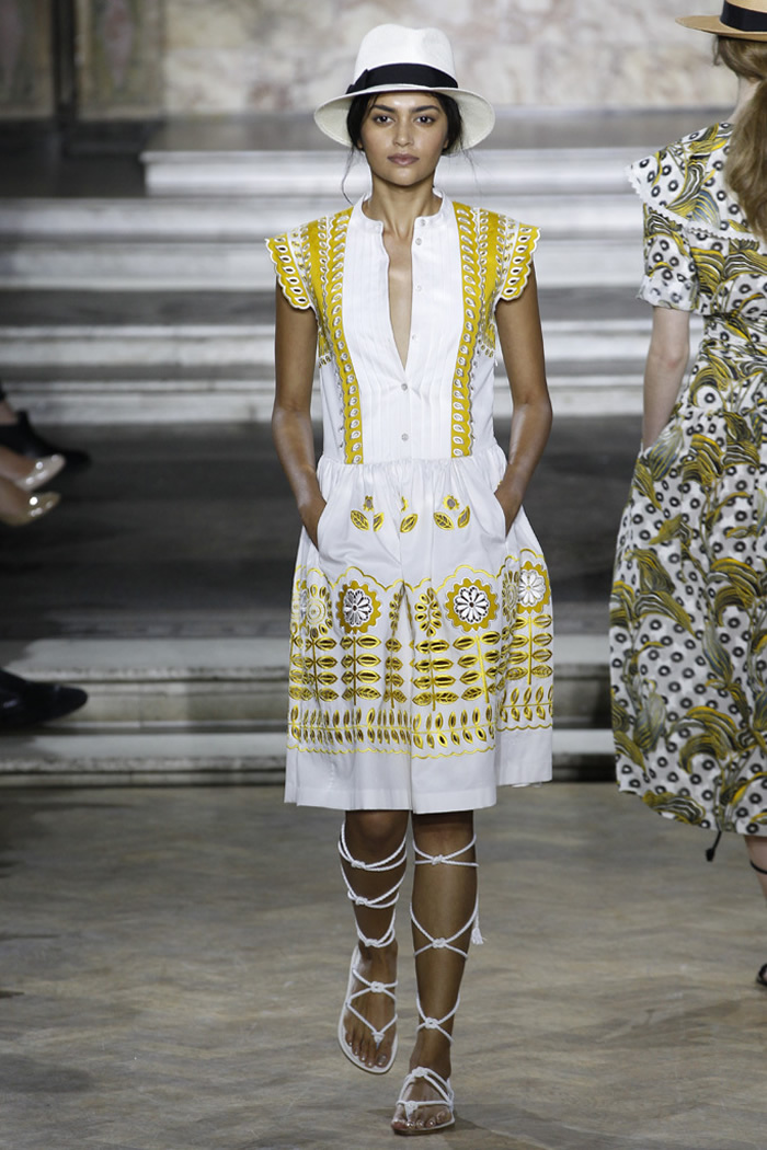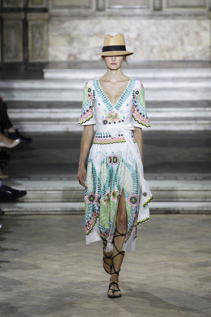 The designer sent out a lineup of dresses covered in embroidery and other needlework done in a summer garden color palette inspired by the images of Robert Polidori. There were belted cotton dresses, many with circle skirts and a ruffle around the neckline; a silky halter-neck dress with a parrot print, and a long cornflower blue one that popped with white embroidery.