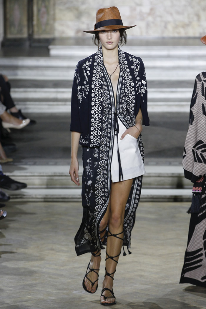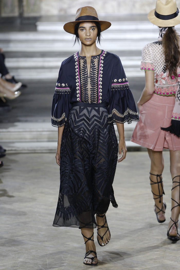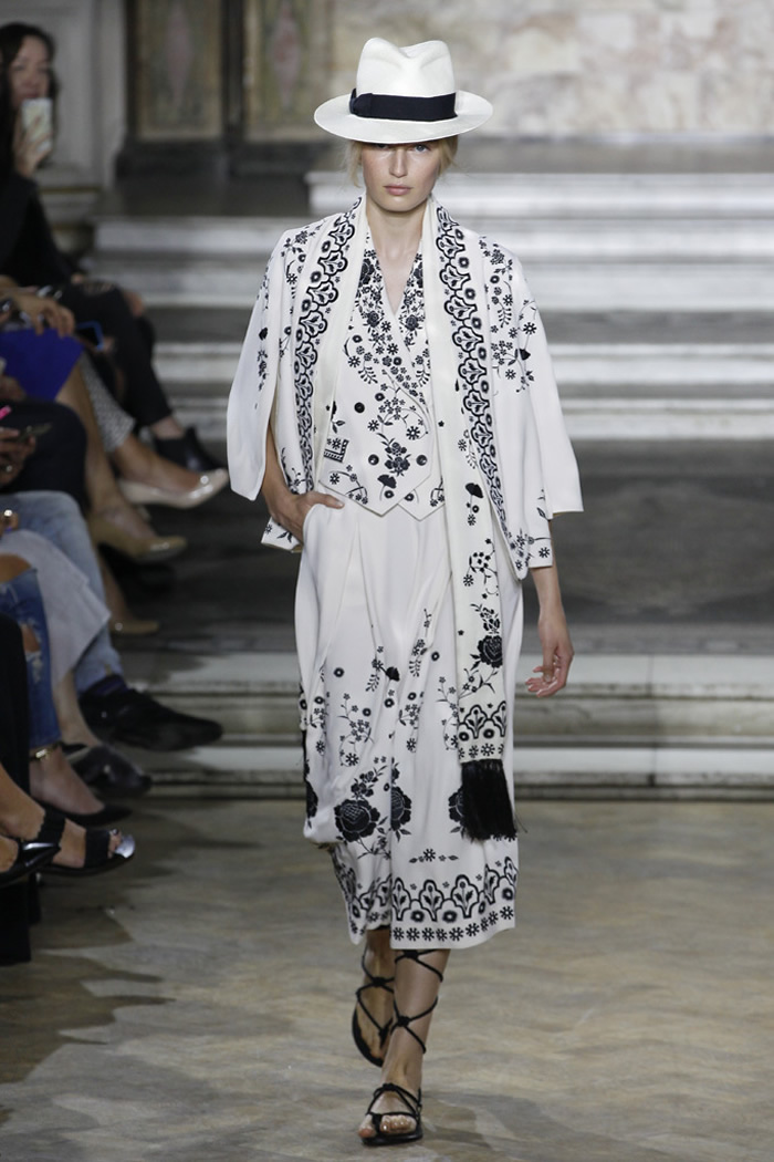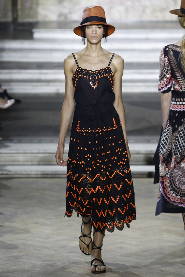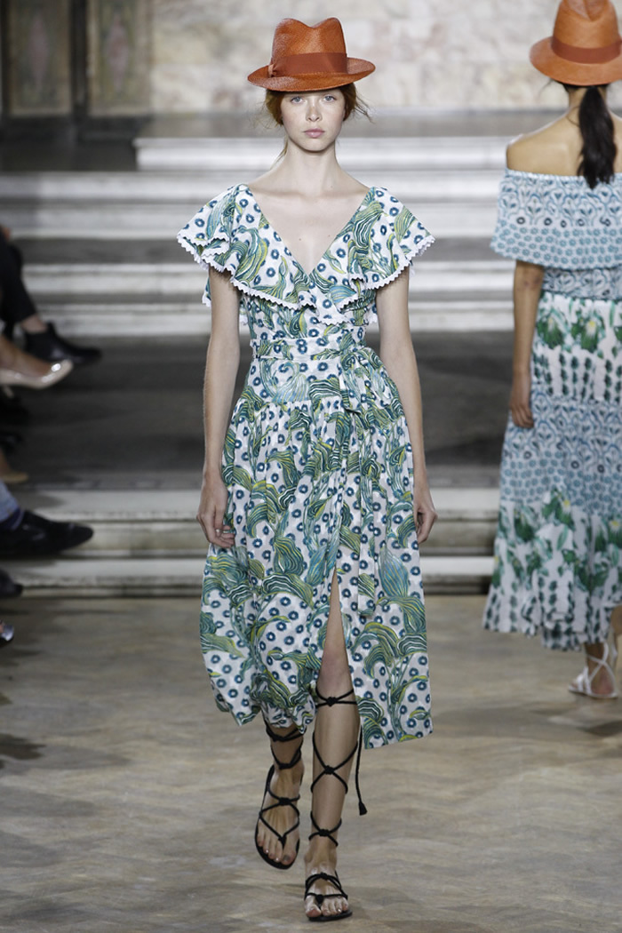 The designer sent out a lineup of dresses covered in embroidery and other needlework done in a summer garden color palette inspired by the images of Robert Polidori. There were belted cotton dresses, many with circle skirts and a ruffle around the neckline; a silky halter-neck dress with a parrot print, and a long cornflower blue one that popped with white embroidery.