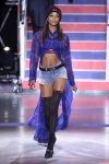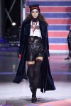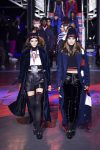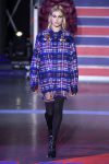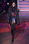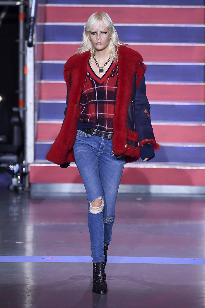 Later, when the red and white lights went down, the Nineties hip-hop cranked up and the show rolled on with models stalking the runway in thigh-high black ribbed tights, cutoff denim, leather shorts and Nineties streetwear lumberjack shirts, leather coats with shearling collars, supersized hoodies, plaid coats and trousers and big fat puffers.