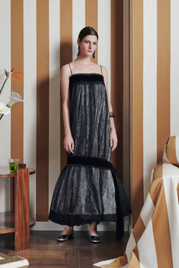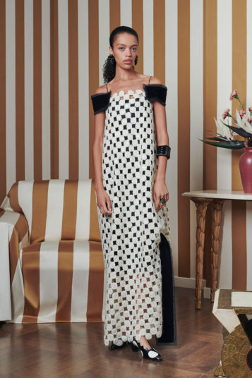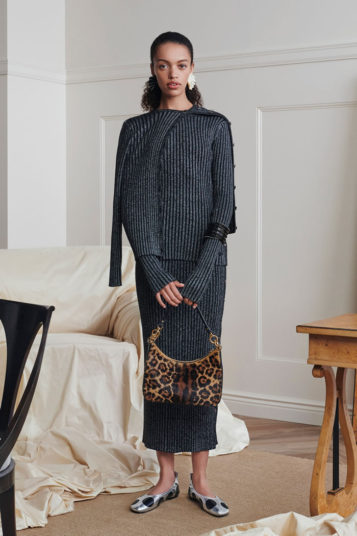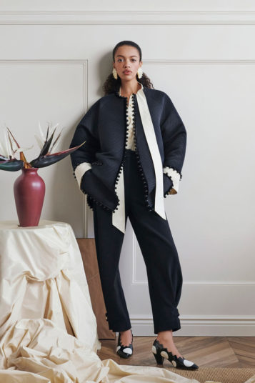 But the clever functionality she built into this season’s clothes is the big story here, be it in the form of the adjustable volume and length of the dotty black-and-white skirt in the lookbook opener, or a removable mint green ruffle on the polo-neck midi dress that appears several clicks later. Fine rib knits feature detachable velvet collars and a shirtdress boasts an easy on-or-off big velvet bow.