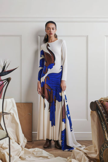 Burch leavened the problem-solving with holiday sparkle and whimsical prints, in the form of easy-wearing pleated lamé separates and a t-shirt dress with art nouveau swans drifting across it.