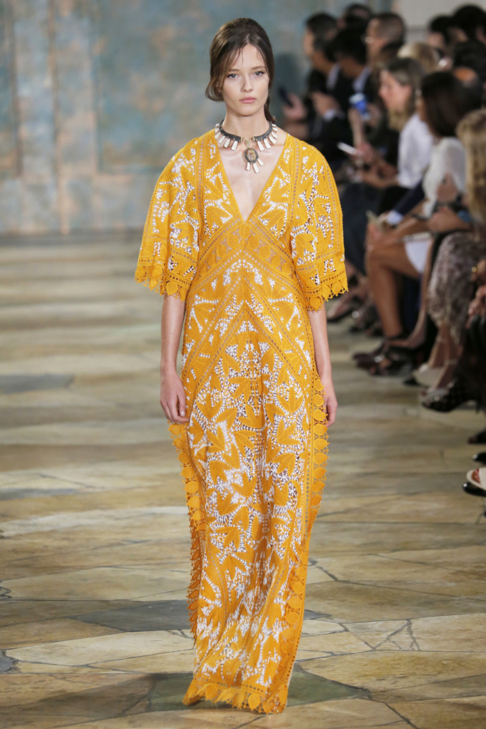 Tory Burch has built her explosive business on a foundation of stylish pragmatism. So much so that one doesn’t think of hers as a flamboyant aesthetic, but in a very real way it is, one replete with decorative effects and lavish color – we all know the lady loves orange. And she’s not afraid of a reference; one of her first items of clothing was a caftan tunic.