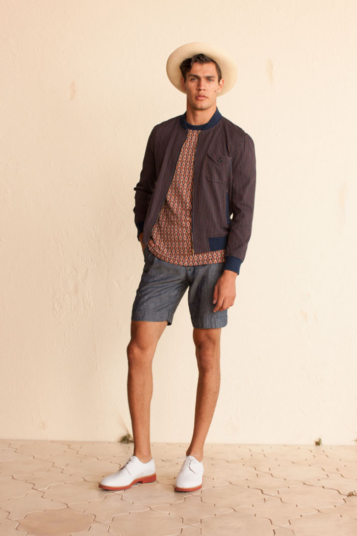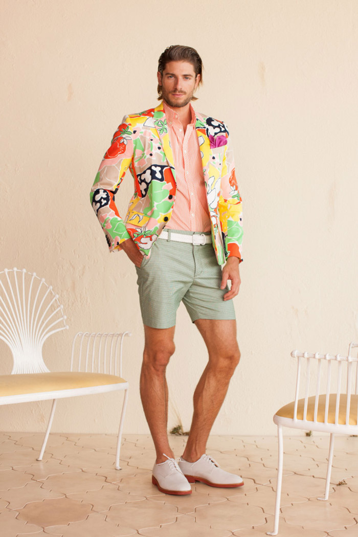 Coppelia, a famous ice cream parlor, was particularly influential in providing the collection’s rainbow swirl print and color palette of tomate, guava, mojito and indigo. The print was featured on cropped trousers, a flirty daydress with ruffle bust, and a one-shoulder top (one of a few new off-the-shoulder evolutions providing shoulder appeal). Other prints included a Tropicana floral done on a new “wiggle” skirt silhouette, styled with a short-sleeve safari chambray jacket taken from the Seventies-esque uniforms worn by women working at the airport.