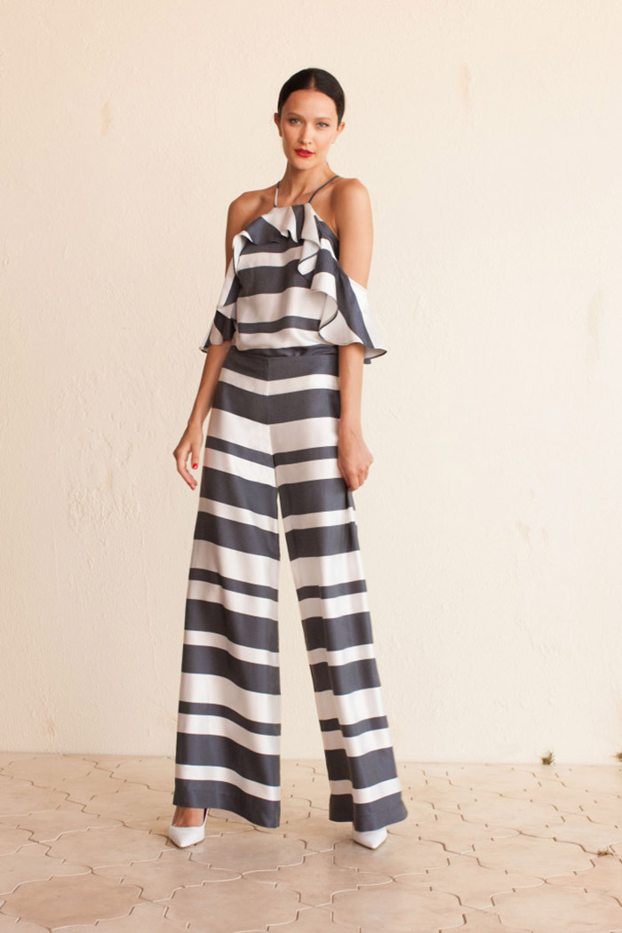 It was the dressier set of offerings that felt particularly modern and appropriate for life outside Havana. There’s an elegance associated with two-pieces designed to be worn together. Standouts included an indigo and white striped off-shoulder top and dramatic pant combo, done in acetate viscose with a shimmer effect, as well as a long white tunic with matching shorts and border stitch detail. Turk was able to interpret the old tropical glamour of Havana and make it feel accessible.