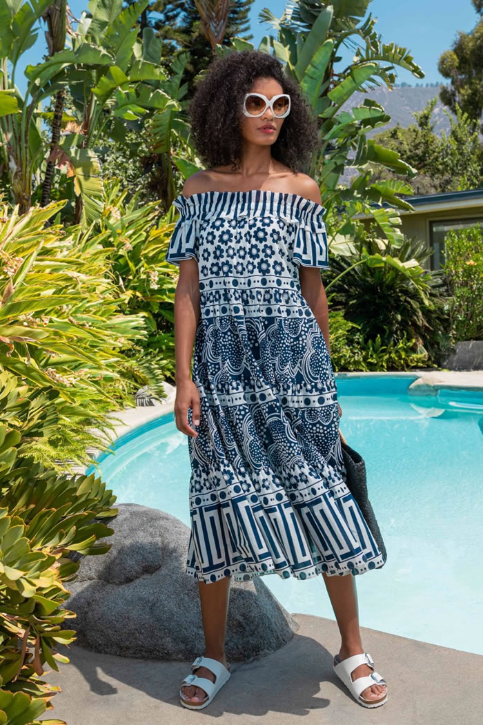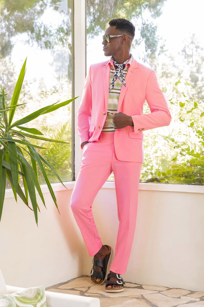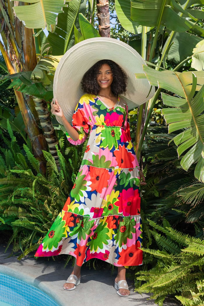 So for her spring 2022 collection, she went all out celebrating her beloved Palm Springs once again, with vintagey florals, geo patterns, caftans, and cabana sets begging for swimming pools and swizzle sticks.