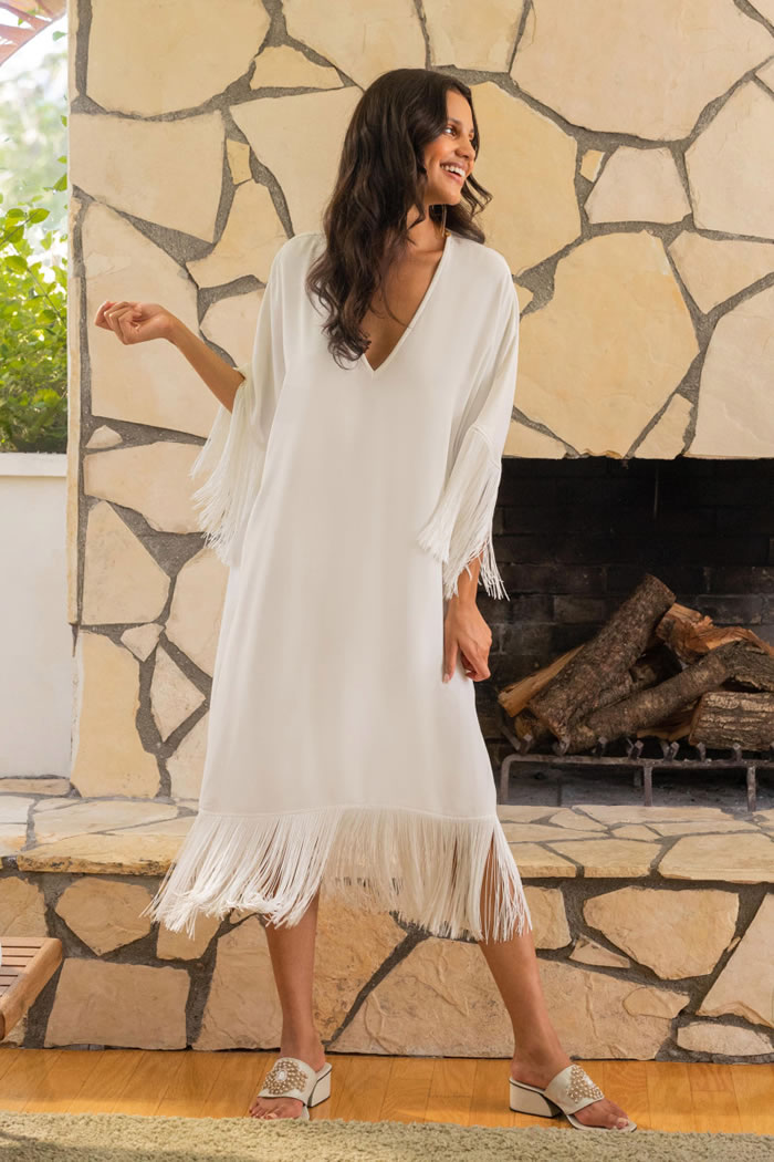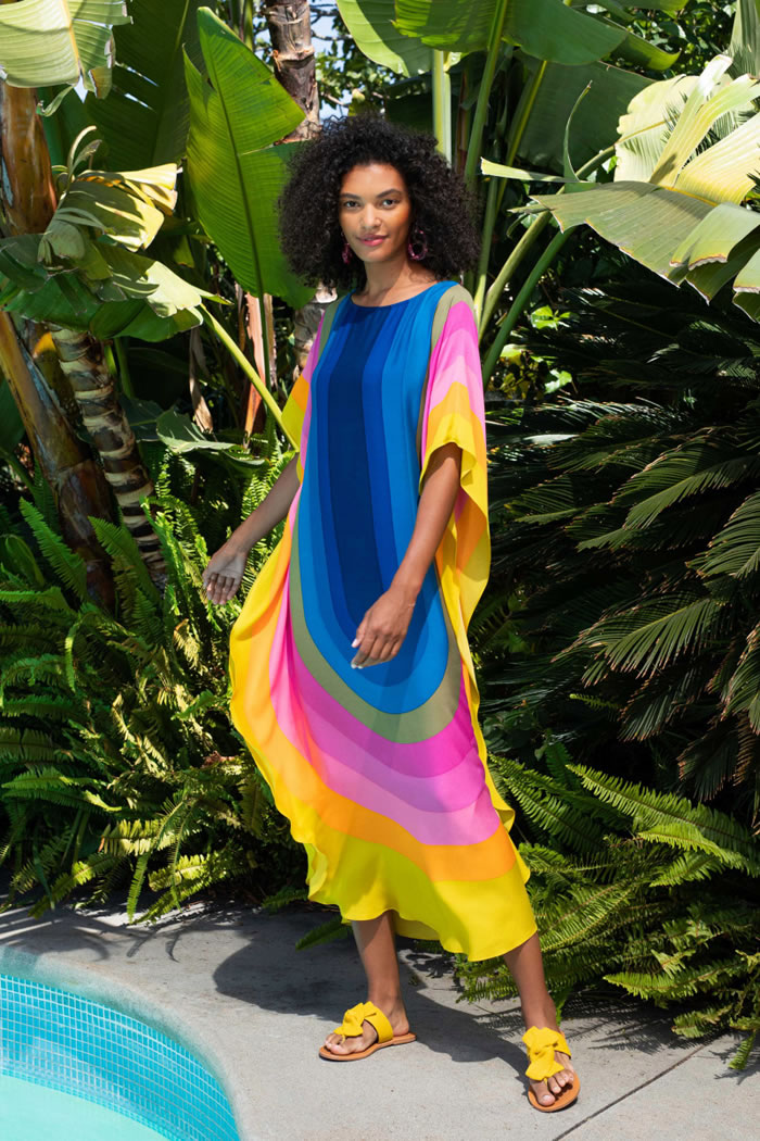 U-shaped swoops of rainbow color on caftans and a pink-and-orange geo print on the tassel-trimmed tunic, aloha shirt, blazer, and shorts had the resort feel Turk built her name on, with a wide range of styles to appeal to all ages and sizes.