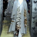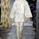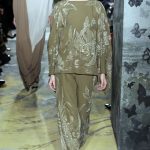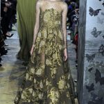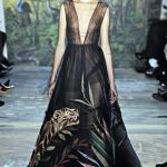 Maria Grazia Chiuri and Pierpaolo Piccioli have developed into couture’s most unabashed romantics. For the Valentinocollection they showed on Wednesday evening, their starting point was opera. Intrigued by the work of set designer Maurizio Varamo of the Teatro dell’Opera di Roma, they enlisted him to design the floor coverings that snaked through the salons of the Hôtel de Salomon Rothschild. Rather than one continuous motif, Varamo delivered several, laid down continuously like oversize tiles — flowers, branches, butterflies flying into the clouds.