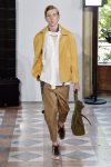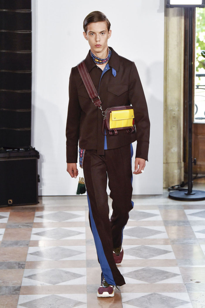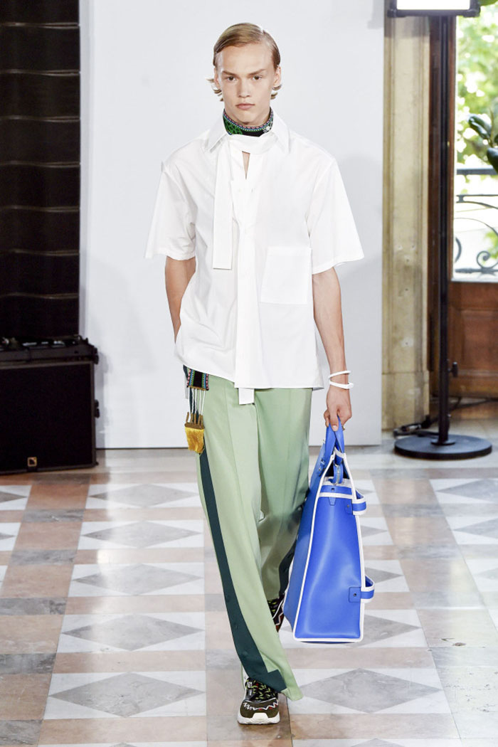 Instead, Piccioli offered luxed-up track suits finely embellished with rows of white beads or contrasting white stitching. Wide-leg jogging bottoms could easily substitute for dress pants: witness a chic pair in mint and forest green, worn with a crisp white poplin short-sleeve shirt with a buttoned scarf at the neck.
