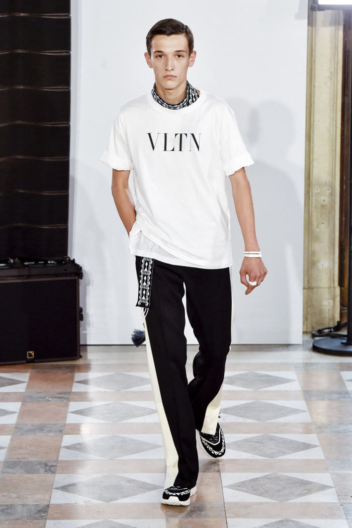 A new logo the epitome of collective identification anchored many of the looks. The VLTN emblem, rendered in the brand’s traditional font, appeared on items including white T-shirts that looked like a surefire commercial hit (indeed, blogger Bryanboy was already sporting one in the front row.)