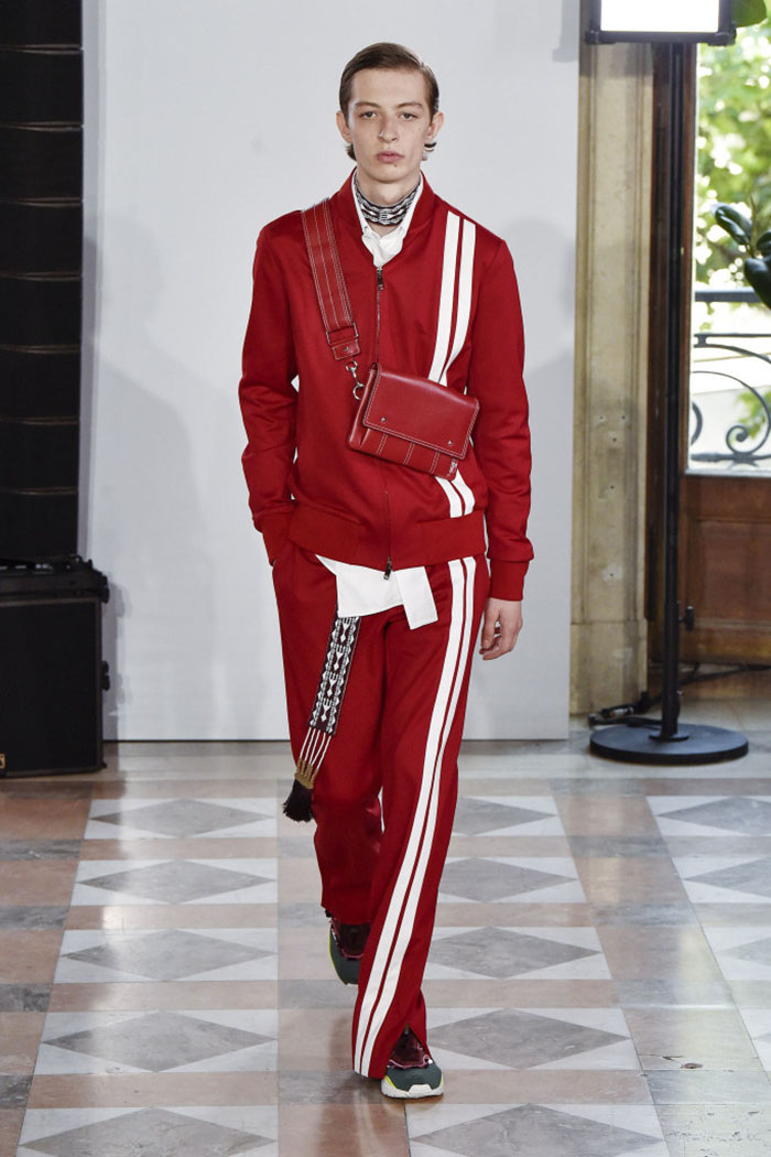 Instead, Piccioli offered luxed-up track suits finely embellished with rows of white beads or contrasting white stitching. Wide-leg jogging bottoms could easily substitute for dress pants: witness a chic pair in mint and forest green, worn with a crisp white poplin short-sleeve shirt with a buttoned scarf at the neck.