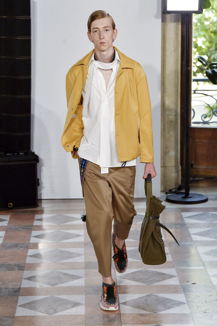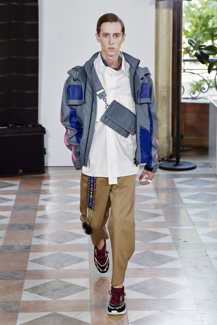 Outerwear was equally upscale. A graphic windbreaker was made of ultra lightweight leather, while anoraks blended nylon, leather and technical mesh with Central American inspired touches like woven belts, geometric embroidery and colored trims.