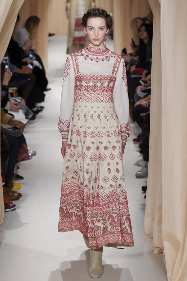 Love is all that Maria Grazia Chiuri and Pierpaolo Piccioli can give to you. Love and folkloric charm, exquisite embroideries, rustic base fabrics, Juliet gowns, angel-wing bodices, a shearling corset to “protect the heart,” Italian pop songs and a line or two of Dante. All delivered with haute toniness and funneled through an homage to Marc Chagall, who lived a Russian country life before becoming a French citizen, and who, Piccioli noted backstage, as a French Jew stayed remarkably positive during World War II.