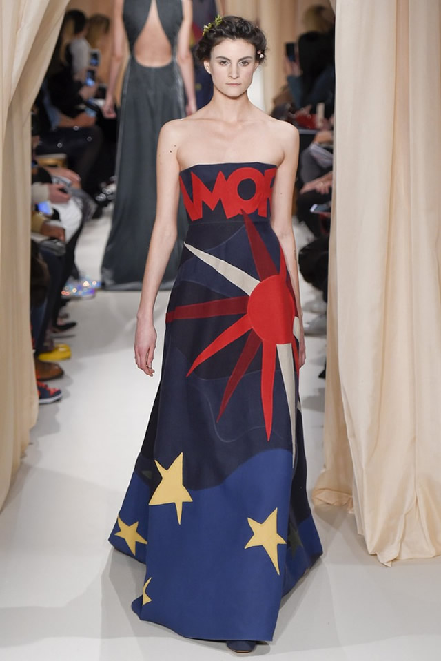 The designers knew when to say when with the decoration, offering interludes of plain — as in an unadorned gown in blue velvet on muslin. And they lightened up with a series of ethereal embroidered gowns. Exquisite in the vacuum of couture, these resonated with particular strength as the Oscars near. While it would be divine to see an actress work one of the more covered-up looks, it’s unlikely that Rosamund Pike or Keira Knightley will opt for a long-sleeved natural linen dress that might have been perfect for a medieval shepherdess on prom night (meant as a compliment to the dress.) But Chiuri and Piccioli proved that revealing has a range beyond mundane to vulgar. Their full-skirted beauties were embroidered with abstract motifs and heavenly clouds and poetic script. The simplest among them, with a linen corset atop a dusty tulle skirt, bore the single line “Amor Vincit Omnia.” Love conquers all. That Virgil, he really understood the passions triggered by a great dress.