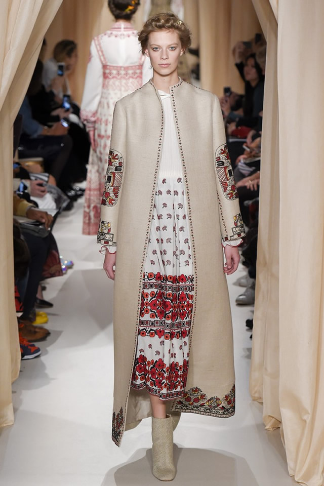 Got it? No matter. That’s one of the splendored things about fashion, which, like love, has many. Those of us unskilled in assembling a reference — and a symbol-heavy mental collage into a visual tale of coherence and chic — can sit back and enjoy the couturiers’ work. In the Valentino collection they showed on Wednesday evening to close the spring 2015 season, Chiuri and Piccioli delivered a gem. They’ve built something very special, more or less reinventing the house while neither alienating its founder nor rejecting his codes, a fact brought into sharp focus by the all-white collection they showed in New York just a month or so ago. For spring, their now-signature romance swung folkloric, inspired by Chagall’s Russian country life, and came in graphically embroidered linens and muslins worn in modest layers, apron dresses over blouses, long wool capes over jeweled muslin linen and hopsack. These bore an appealing heaviness.