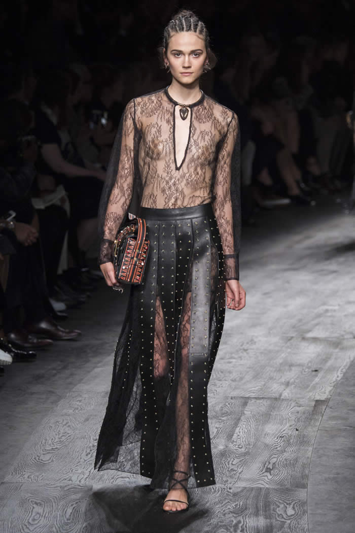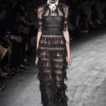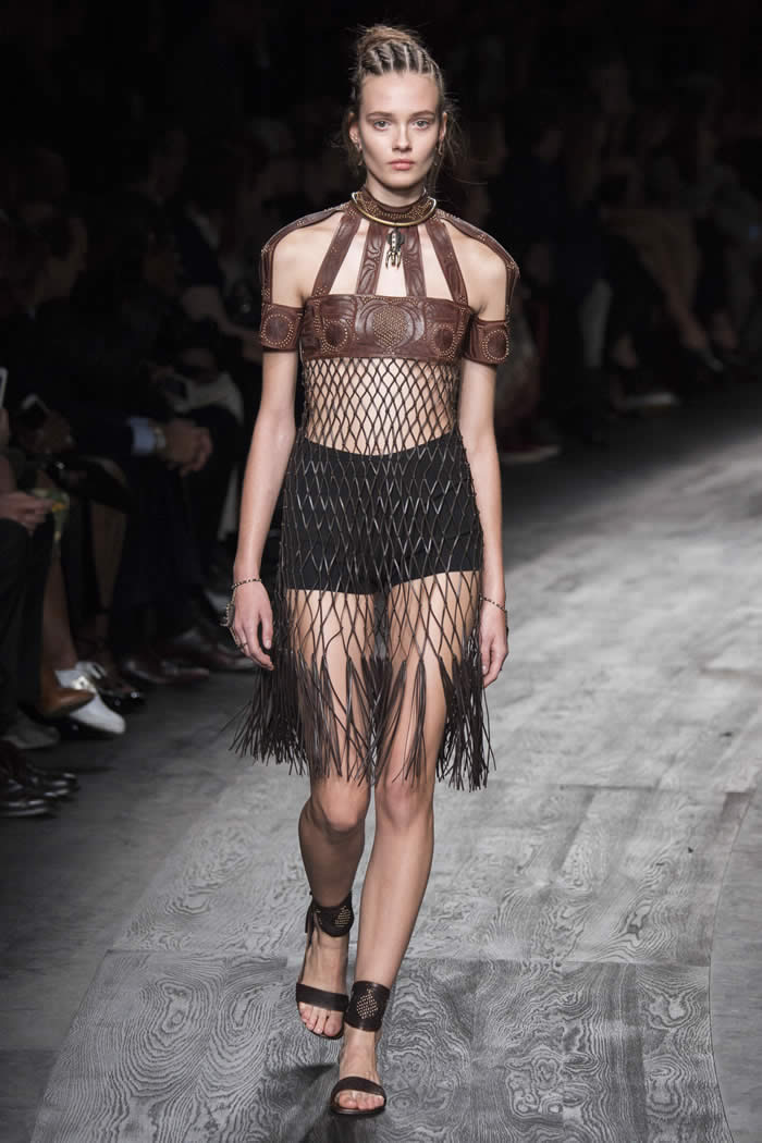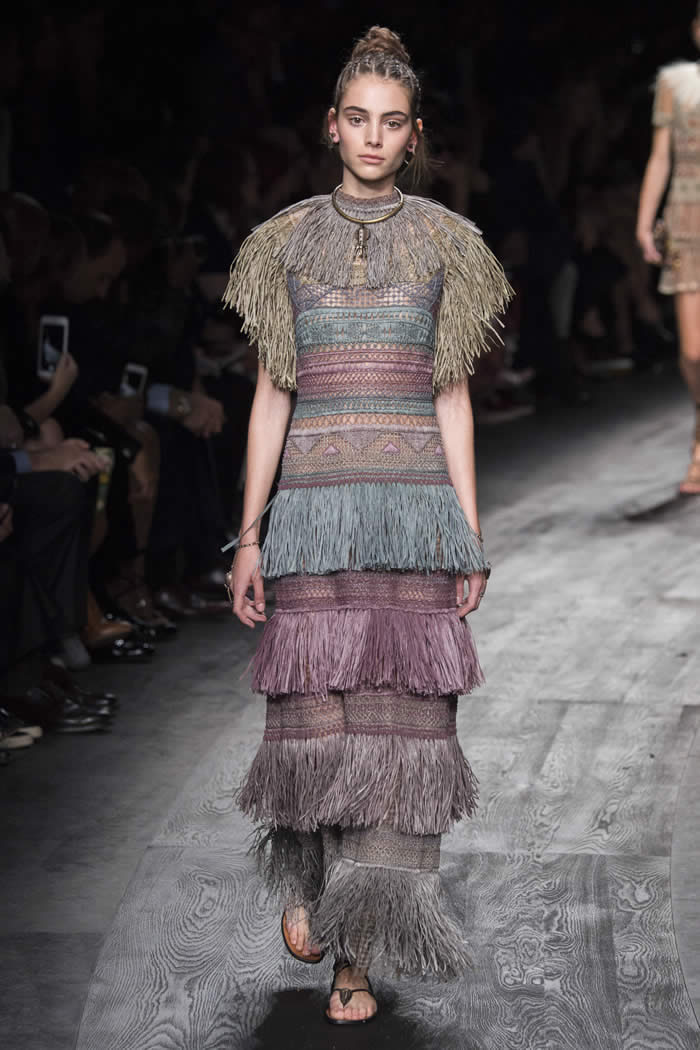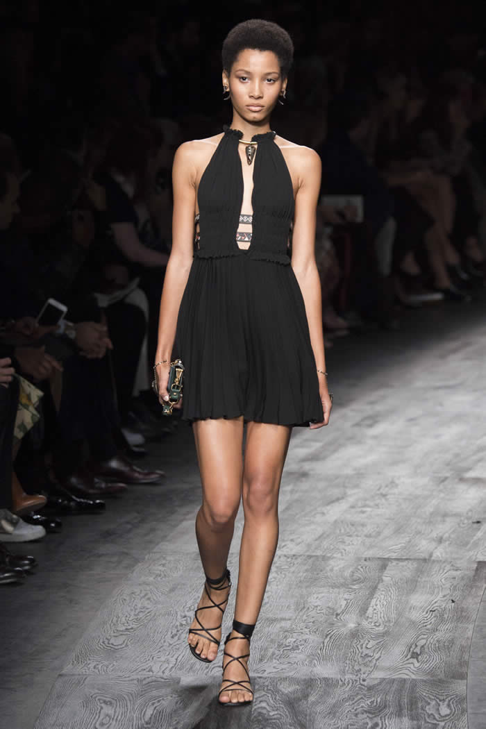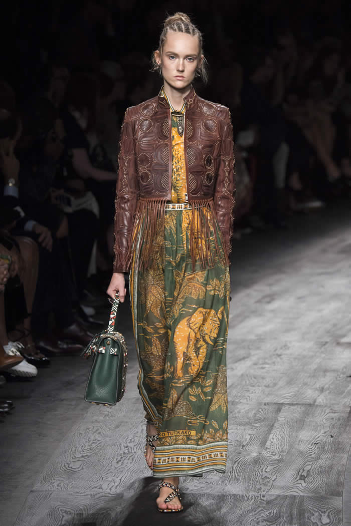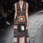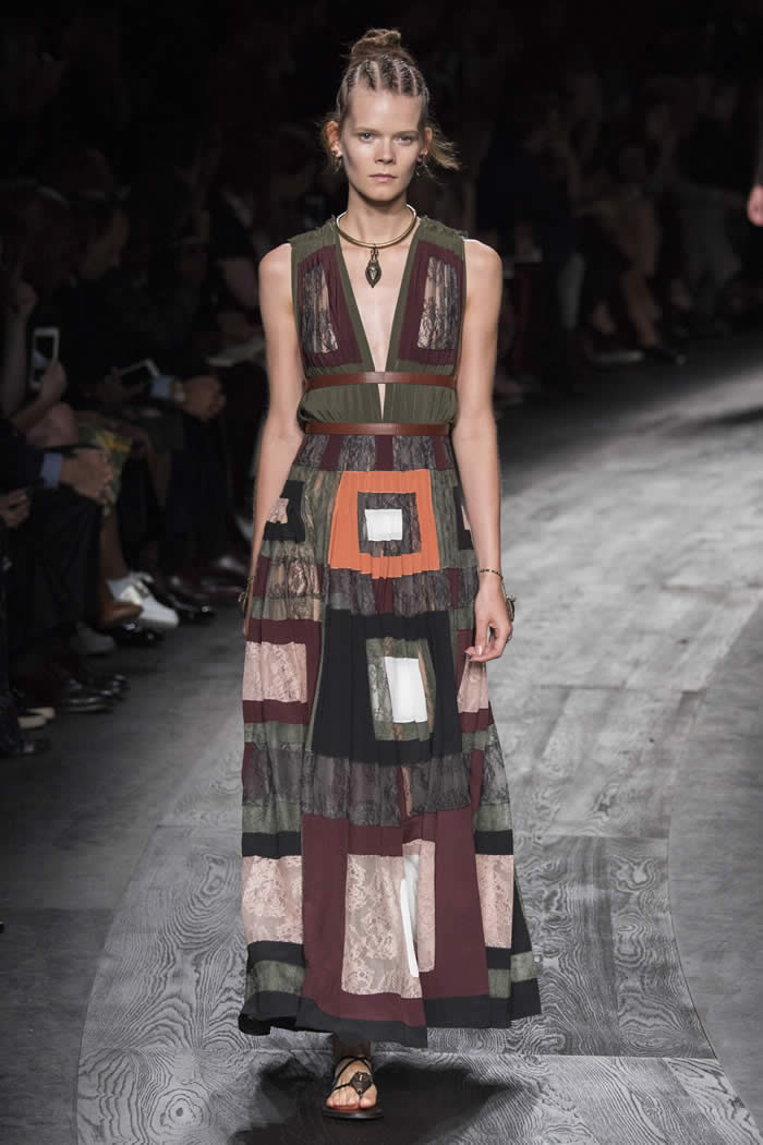 There were colorful patchworks, both folkloric and modern. Tribal embroideries were worked up and down sleeves and collars of day dresses. Two gowns in blush tulle delicately embroidered with white tribal markings and trimmed in majestic ivory feathers around the collars and cuffs were absolutely breathtaking. A wild tie-dye moment represented more robust daywear options, with athletic military jackets and cargo pants worn with backless fringed knits. Leather work was exceptional, on the woven mesh dresses suspended from etched harnesslike tops, carved corsets layered over printed dresses and a maxiskirt cut in vertical strips of studded leather layered over a black lace dress. Some of the collection’s most impressive moments came when Chiuri and Piccioli interwove indigenous African motifs with others that were classically Western.