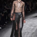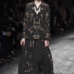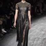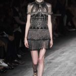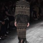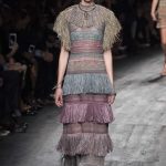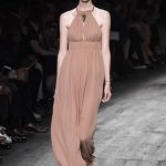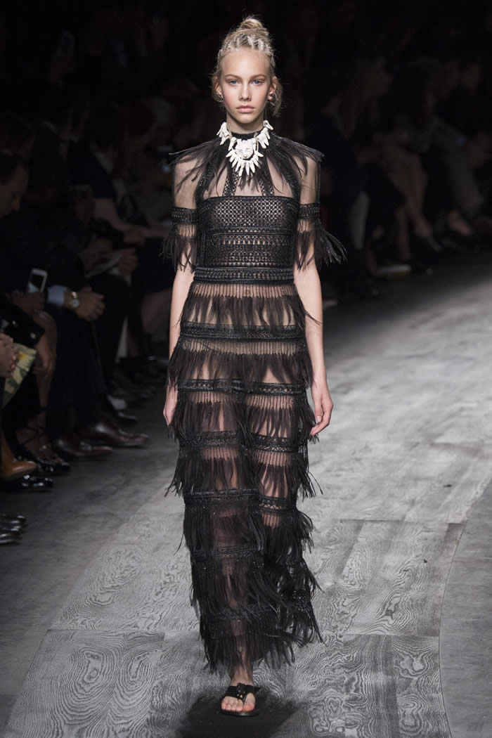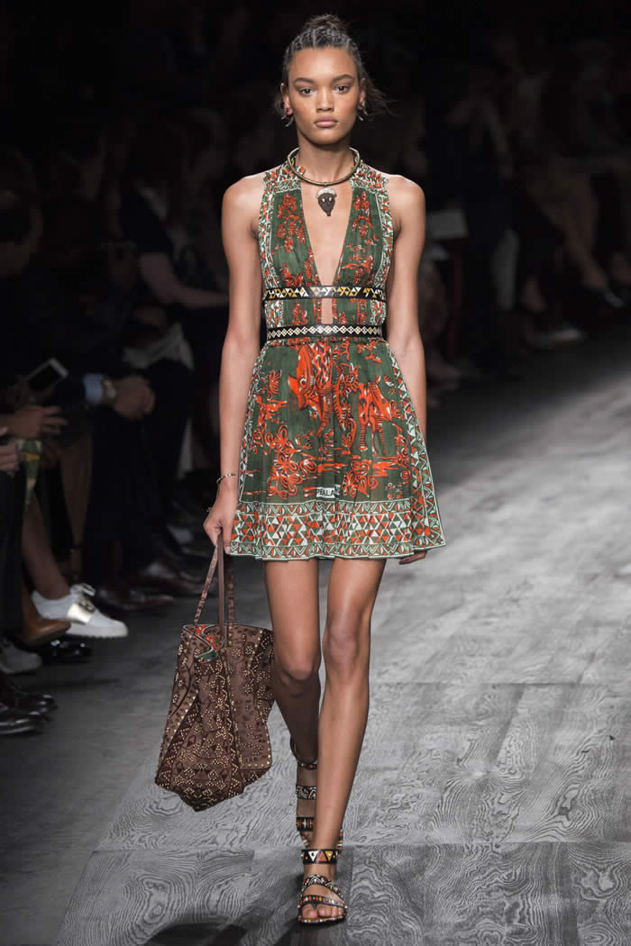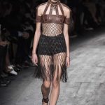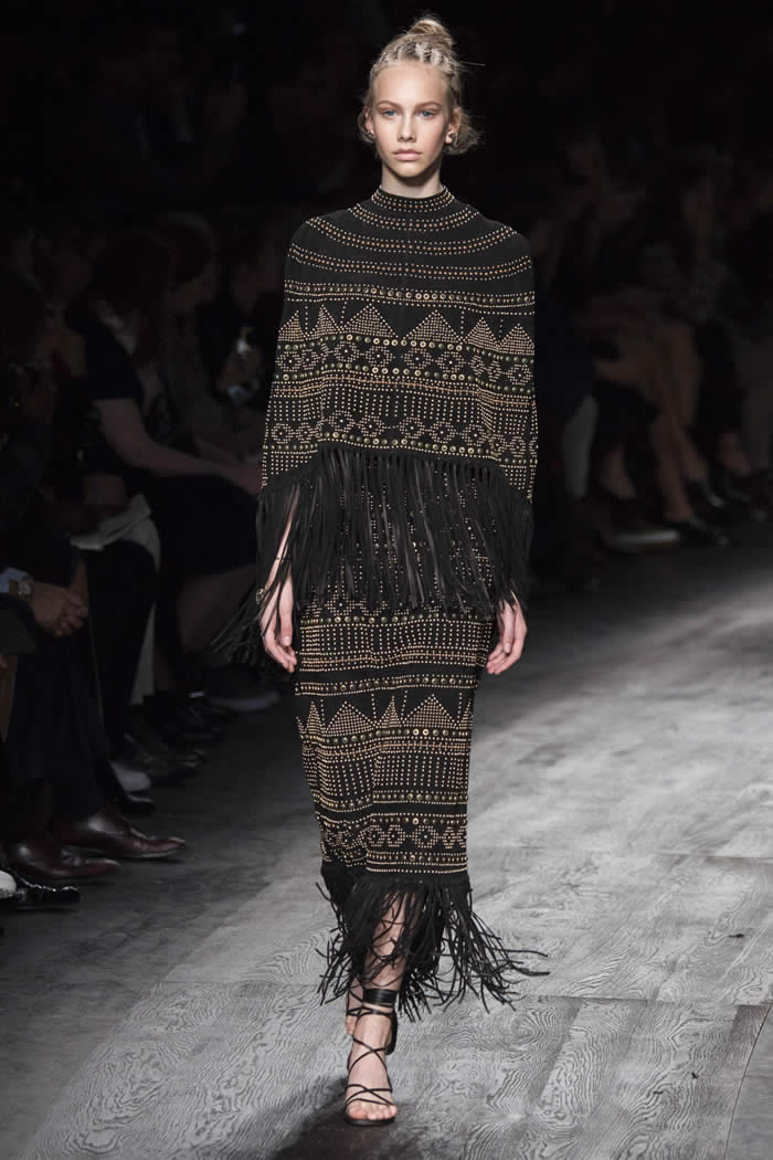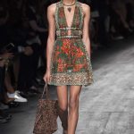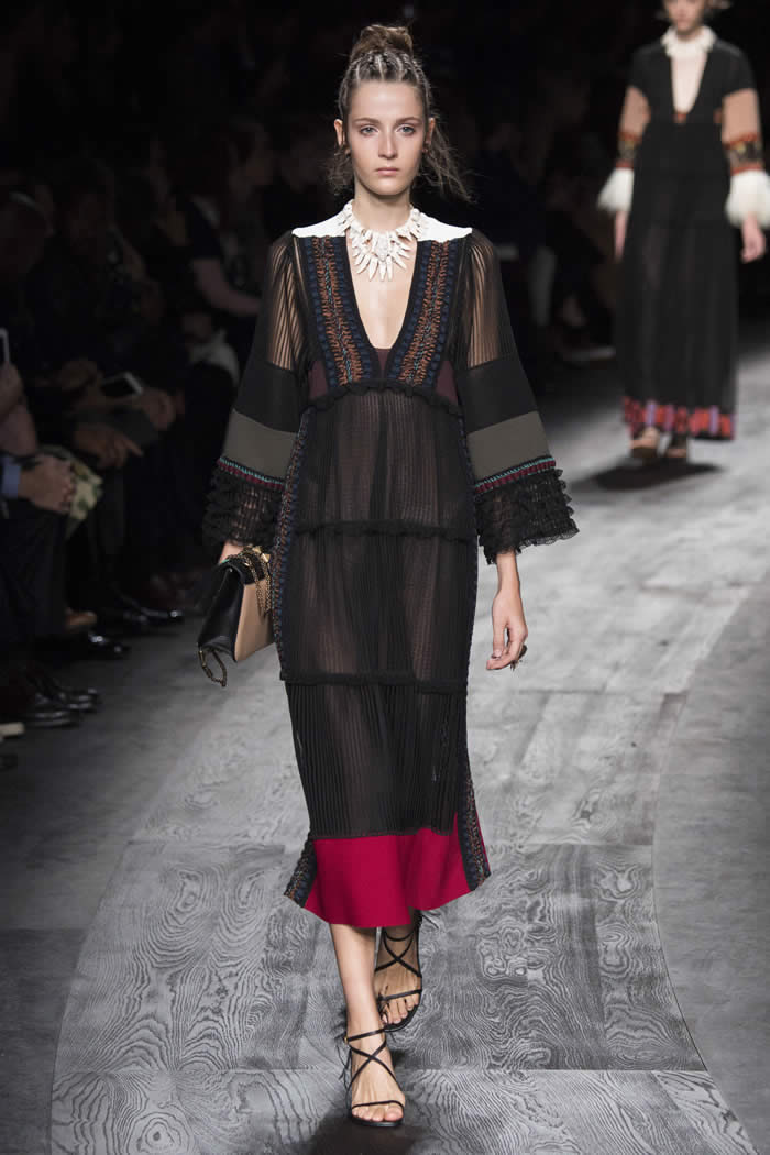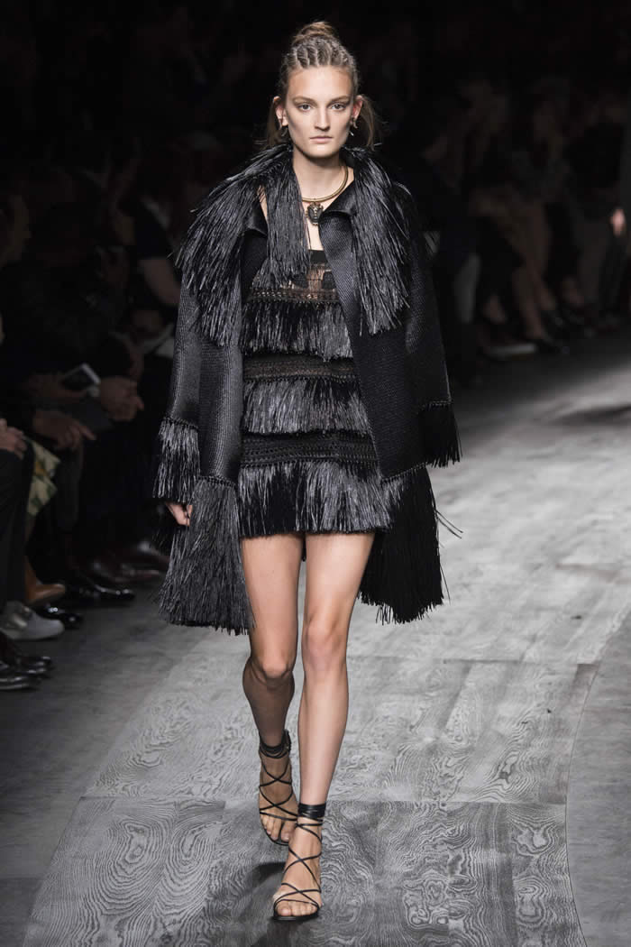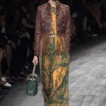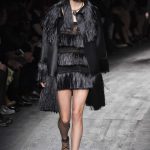 There were colorful patchworks, both folkloric and modern. Tribal embroideries were worked up and down sleeves and collars of day dresses. Two gowns in blush tulle delicately embroidered with white tribal markings and trimmed in majestic ivory feathers around the collars and cuffs were absolutely breathtaking. A wild tie-dye moment represented more robust daywear options, with athletic military jackets and cargo pants worn with backless fringed knits. Leather work was exceptional, on the woven mesh dresses suspended from etched harnesslike tops, carved corsets layered over printed dresses and a maxiskirt cut in vertical strips of studded leather layered over a black lace dress. Some of the collection’s most impressive moments came when Chiuri and Piccioli interwove indigenous African motifs with others that were classically Western.