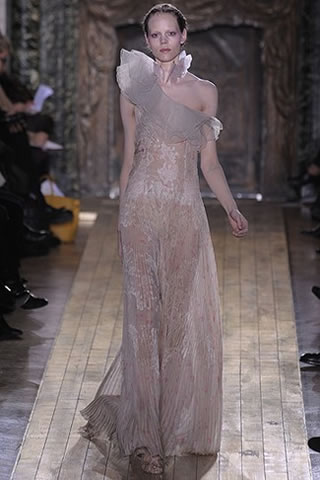 Fashion designer Piccioli’s somewhat opaque words actually helped to explain the paradox of the Valentino s/s 2011 collection: how something so blatantly pretty, pale, and light could also feel like it had an irresistible germ of, if not subversion, then at least oddness. It wasn’t just the penitent hair and makeup, or Freja’s opening outfit, in all its vestal virginity. Chiuri said there was a secret in the collection, in the way the pleats fell, the way the sheer fabrics seemed about to reveal something while keeping it hidden. That secret was presumably the girl inside the clothes. If she was covered up, she wasn’t demure. The fashion models walked with a diffident hauteur, hardly innocent.