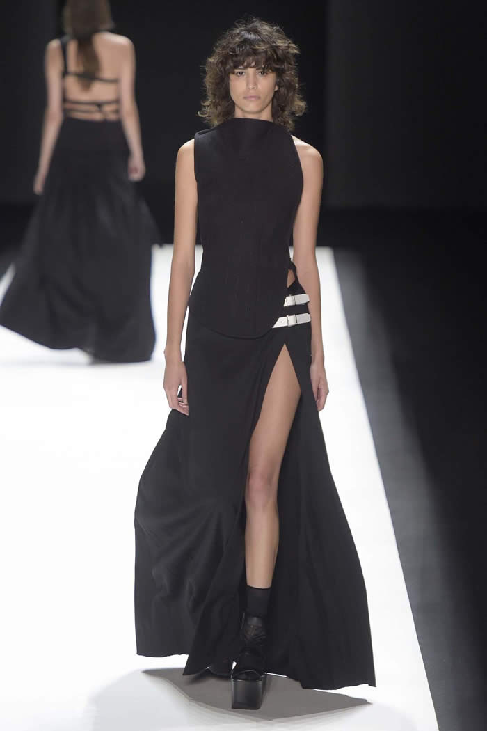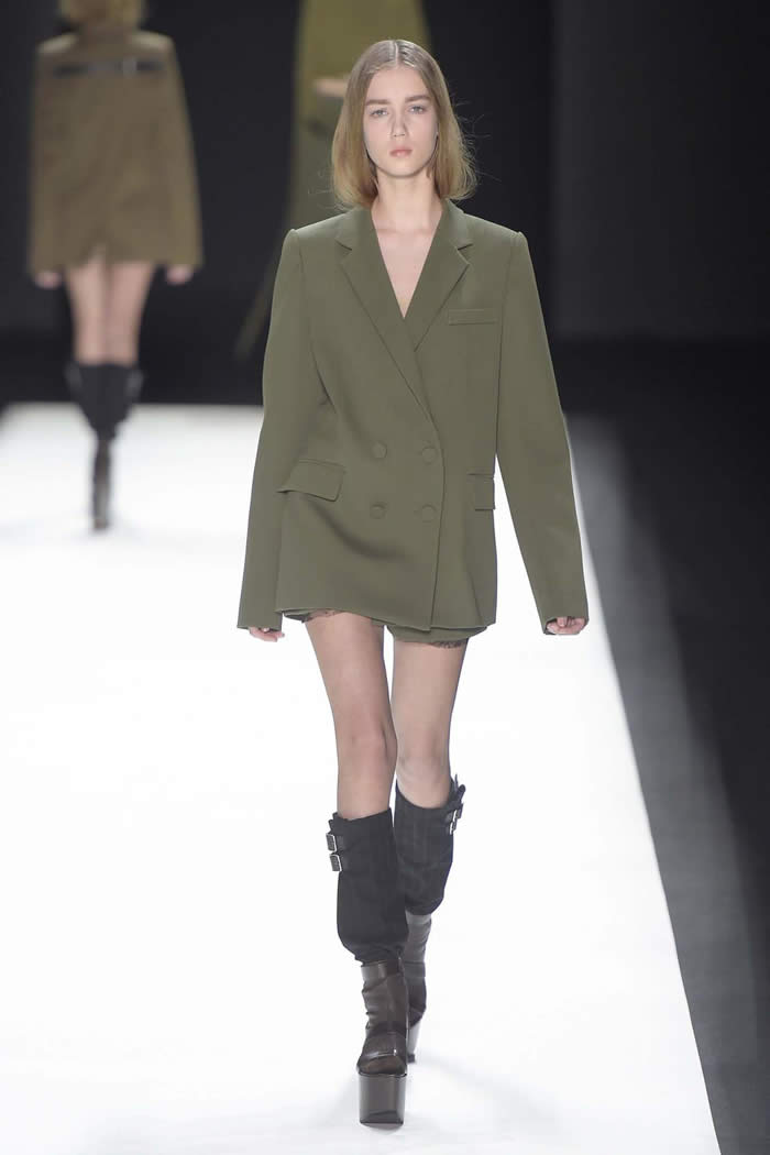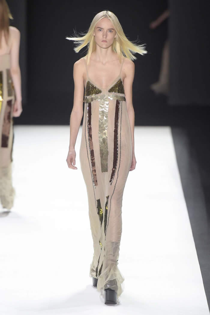 Along the way, Wang worked both aggressive and gentle elements, as well as weight and transparency. A key item: the plastron, integrated into a linear silhouette, exaggerated with monster platform sandals (thick and high), and worn with spats of varying height. The long line was inspired by Giacometti — at least that was the sound-bite spiel. Really, the compelling silhouette came, she said, “in reaction to seeing a lot of minis and a lot of more obvious silhouettes.”