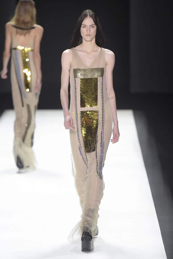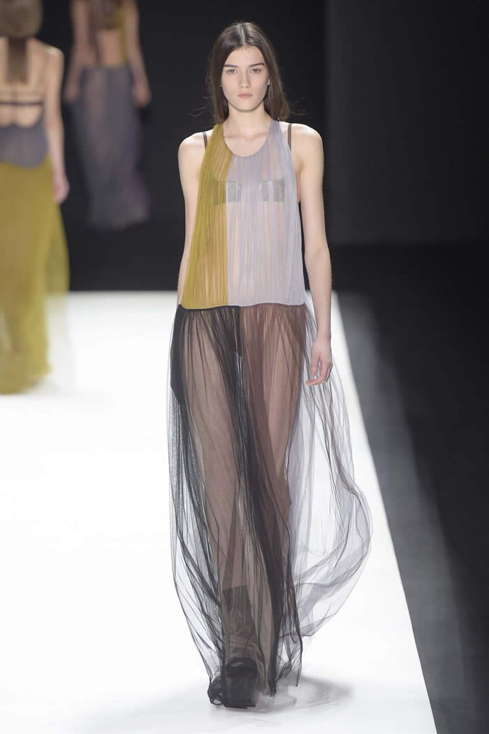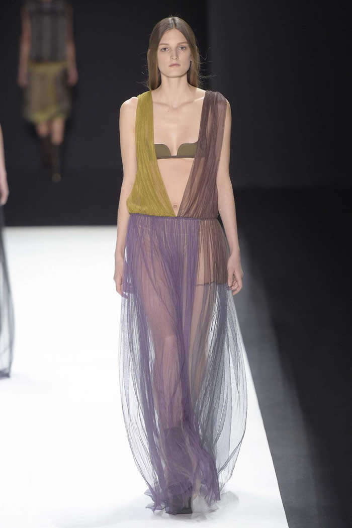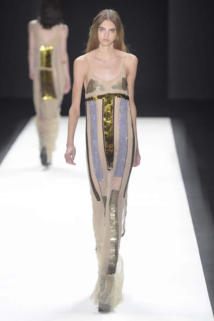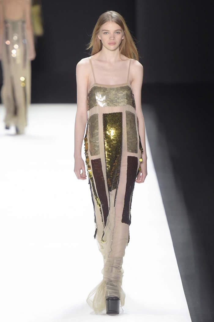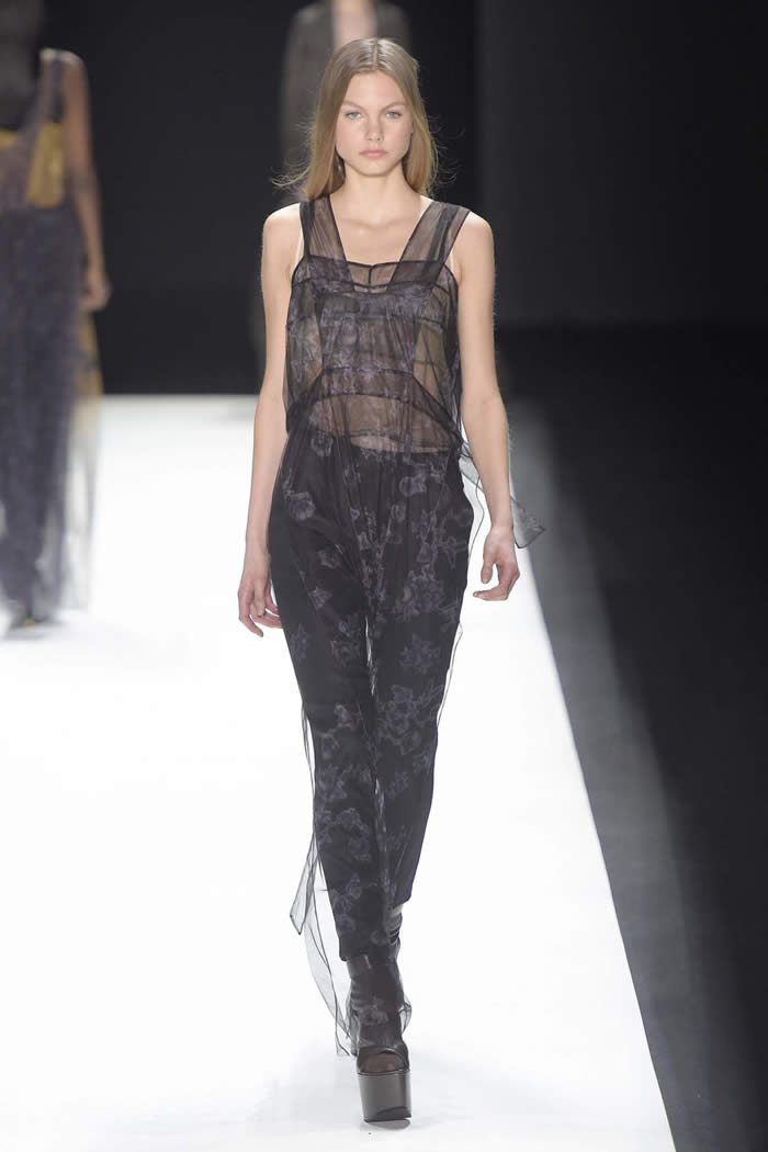 The intentional heft of materials that appeared first in the wool kilts found alternative expression in thick, multicolored furs, including a pair of long vests worn as dresses. Vera Wang then pulled a provocative 180 on the texture front while maintaining the darkly evocative mood. The aforementioned florals blossomed as long, light-as-air robes over lighter chiffon aprons and trousers, while see-through tulle dresses in blocks of somber shades worked the Goth side of sheer over microscopic black wool bras. On the more heavenly front: whisper-delicate nude tulle gowns with panels of geometric sequined embroidery. Both were exquisite and, assuming proper underpinnings in place, cried out for Oscar attention.