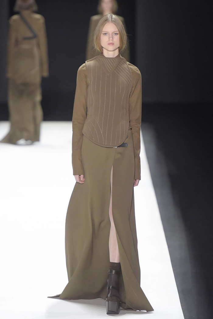 Nothing obvious here. Wang paired the protective fencing plastron to floor-sweeping, open-to-there kilts, shown by day over shirts and by night, over bare skin, the shield’s leather straps taking a tough turn with sexy. The palette, sober shades of olive, dark gold and khaki, in addition to black, harkened to another artful source: Modigliani.