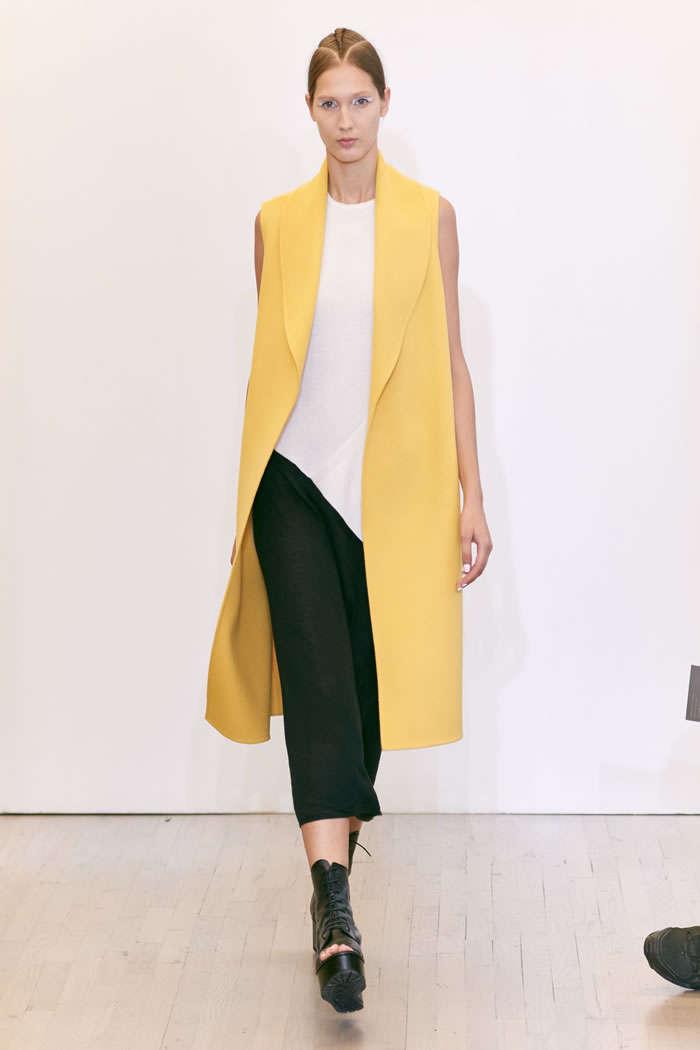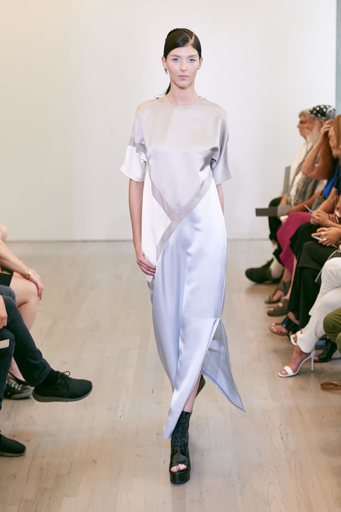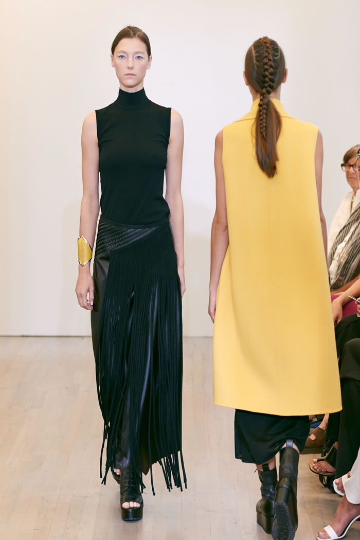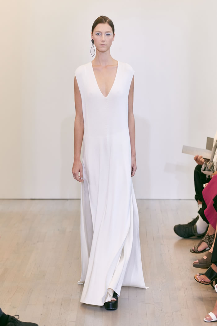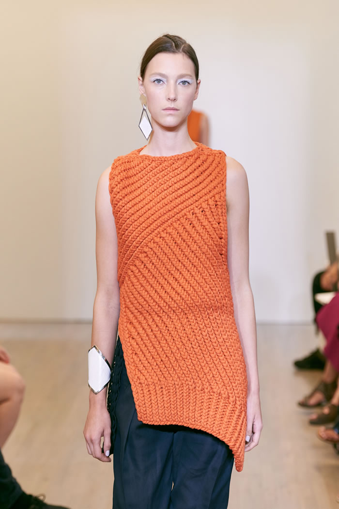 Alfaro has a talent for the statuesque, which he deployed here in (seemingly) simple silk gowns with graphic windowpane insets, terrific long-line jumpsuits and likewise lean cashmere gilets, and various voluminous pants. Tee-shaped dresses and quilted cargo pants introduced a sportier tone, but they still had a certain Georgia O’Keeffe-wandering-the-New-Mexico-desert vibe, one that was ramified by garments such as a floor-length knit cape. (Ellsworth Kelly, meanwhile, provided the punch of yellow and orange in the collection’s palette.) The aura of self-possession in Alfaro’s clothes will, alongside his knits, remake his name in time this ’90s wunderkind seems to be taking the long view and making clothes not so much for this, or any particular, moment, but ones built to last.