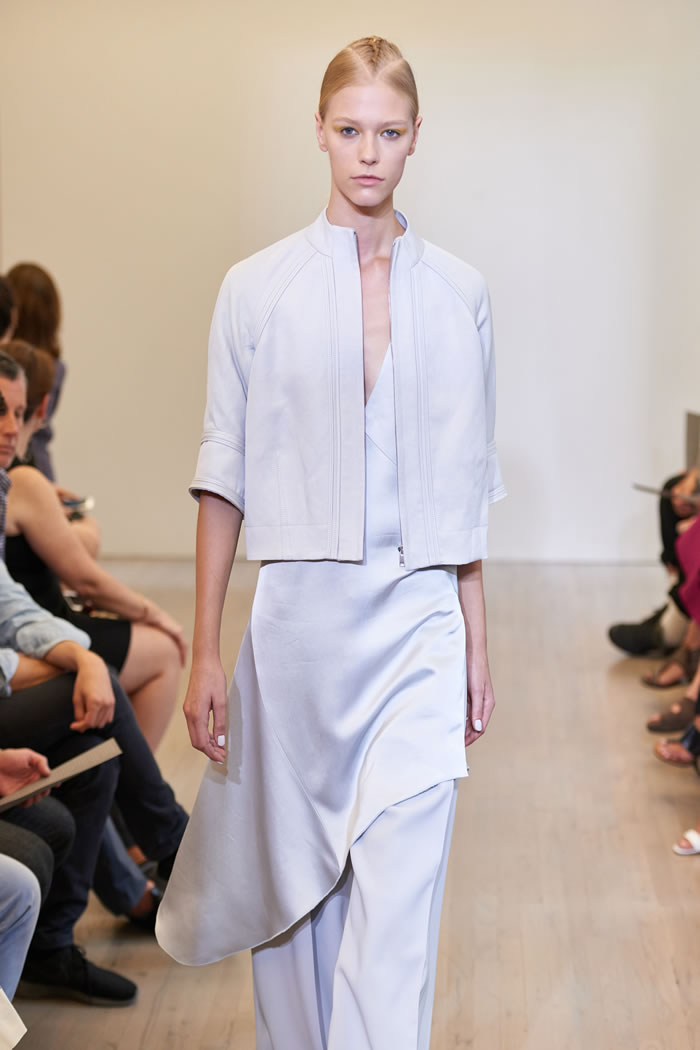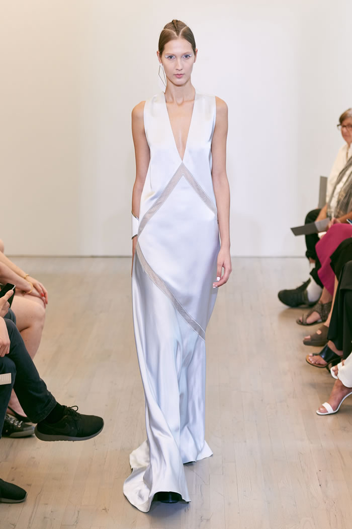 However I touch things, they always look very polished. I just can’t help it.” So noted comeback kid Victor Alfaro after his show today, and indeed, the collection he presented proved his point. The greatest part of the appeal of these clothes was their immaculateness, discovered in the perfect body-skimming fit of a bias-cut silk gown or the piping detail on a white cotton jumpsuit or, of course, in any of Alfaro’s signature knits. Of the latter, the most eye-catching pieces were the dressy sweaters embellished with ribbon embroidery or dangling bugle beads, or patchworked together with lace; the items that stuck with you, however, were the ones that summoned a more monumental effect.