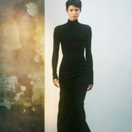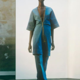 “I don’t ever like to say ‘bad taste’ versus ‘good taste,’ because ‘bad taste’ has a bad connotation. But I like polarizing fabrics,” she said. “I’m really attracted to those more challenging fabrics, and to put something as challenging as an ice blue metallic skirt in, and show that with a beautiful piece of knitwear, I’m always attracted to that.