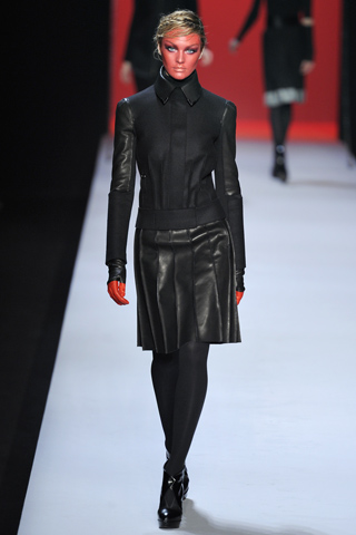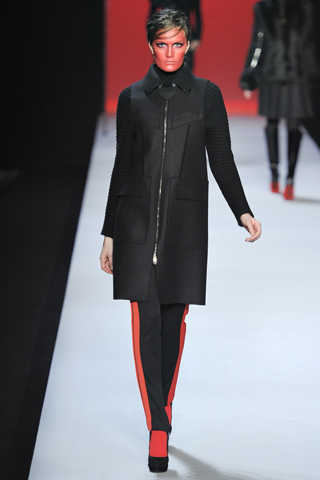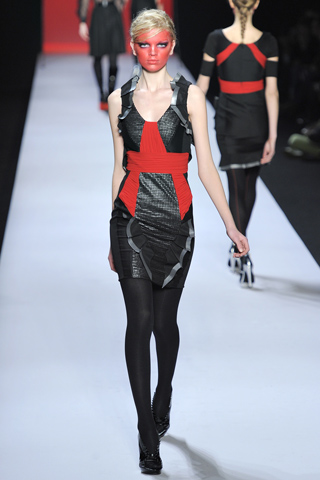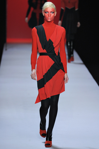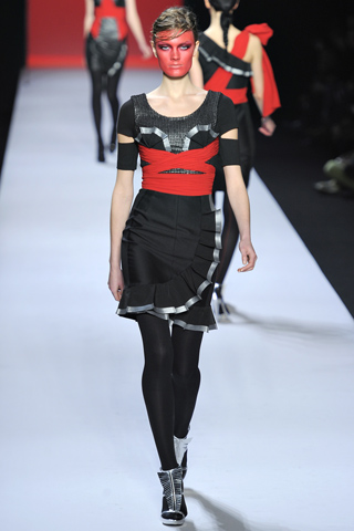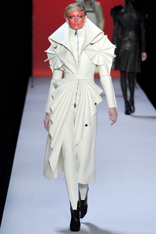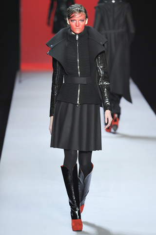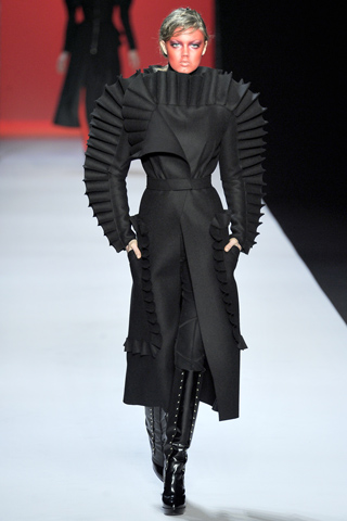 Viktor and Rolf unleashed their fall ready-to-wear collection 2011 by sending down the runway a legion of red-faced warriors in long coats done in bonded, felted wool that was crimped into bladelike pleats around collars and shoulders like giant scales or pinwheels making a dramatic statement softened slightly by a few ruffled and draped silk dresses, as well as two rose-printed sweaters worn with pleated skirts. Besides, everything was done in a strict palette of black, red and ivory with an occasional flash of silver to ensure the utmost graphic effect. Enjoy the lates collection catwalks from Paris Fashion Week Ready-to-wear Fall/Winter 2011-2012.