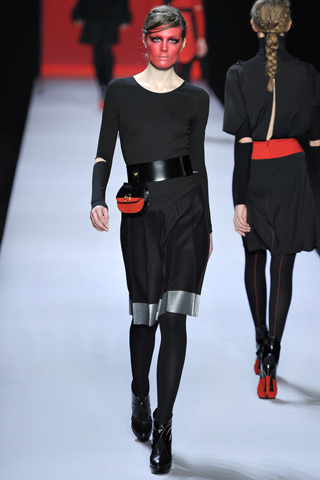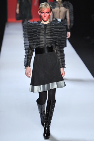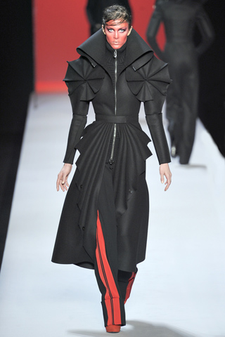 Viktor and Rolf unleashed their fall ready-to-wear collection 2011 by sending down the runway a legion of red-faced warriors in long coats done in bonded, felted wool that was crimped into bladelike pleats around collars and shoulders like giant scales or pinwheels making a dramatic statement softened slightly by a few ruffled and draped silk dresses, as well as two rose-printed sweaters worn with pleated skirts. Besides, everything was done in a strict palette of black, red and ivory with an occasional flash of silver to ensure the utmost graphic effect. Enjoy the lates collection catwalks from Paris Fashion Week Ready-to-wear Fall/Winter 2011-2012.