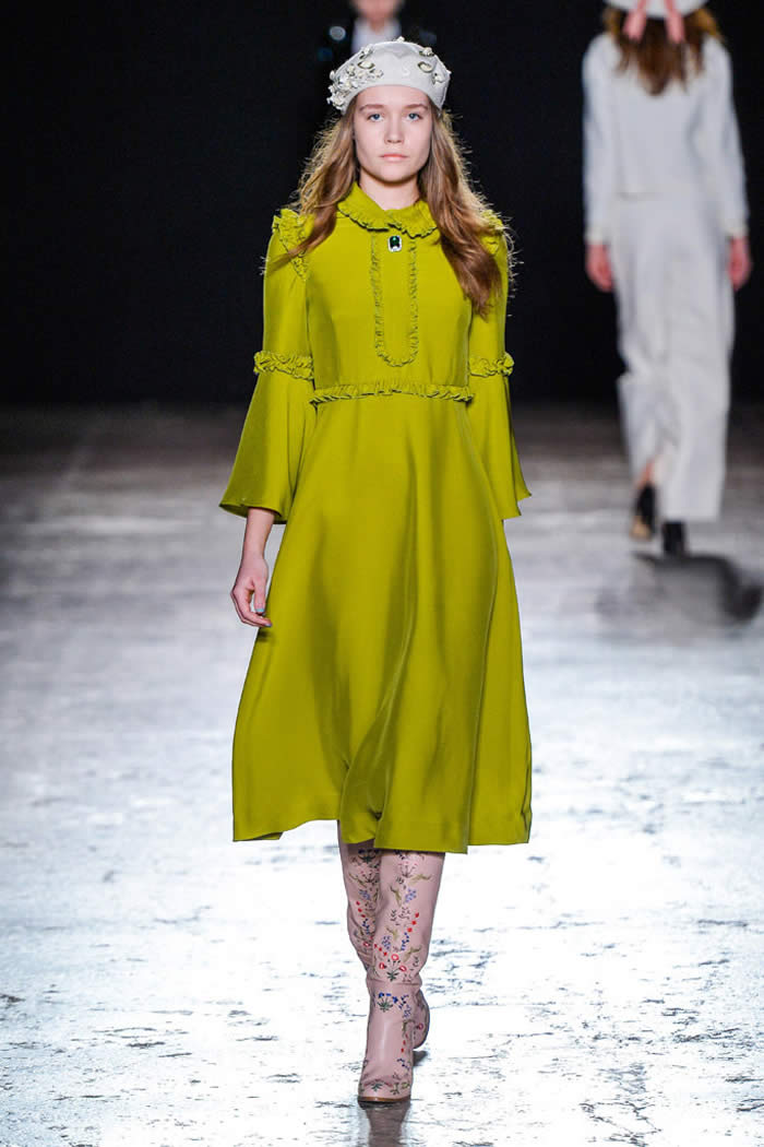 If you style a sheer, bow-tied ruffled dress with a beret, or pair a hyperfeminine outfit with nerdy eyeglasses, socks and slippers, the look is bound to suggest one thing these days: Gucci. For fall, Vivetta Ponti took the Alessandro Michele effect too far. That eccentric, hyperdecorative style is definitely part of the designer’s aesthetic, but many of the looks felt too similar to those on Gucci’s catwalk the past few seasons.