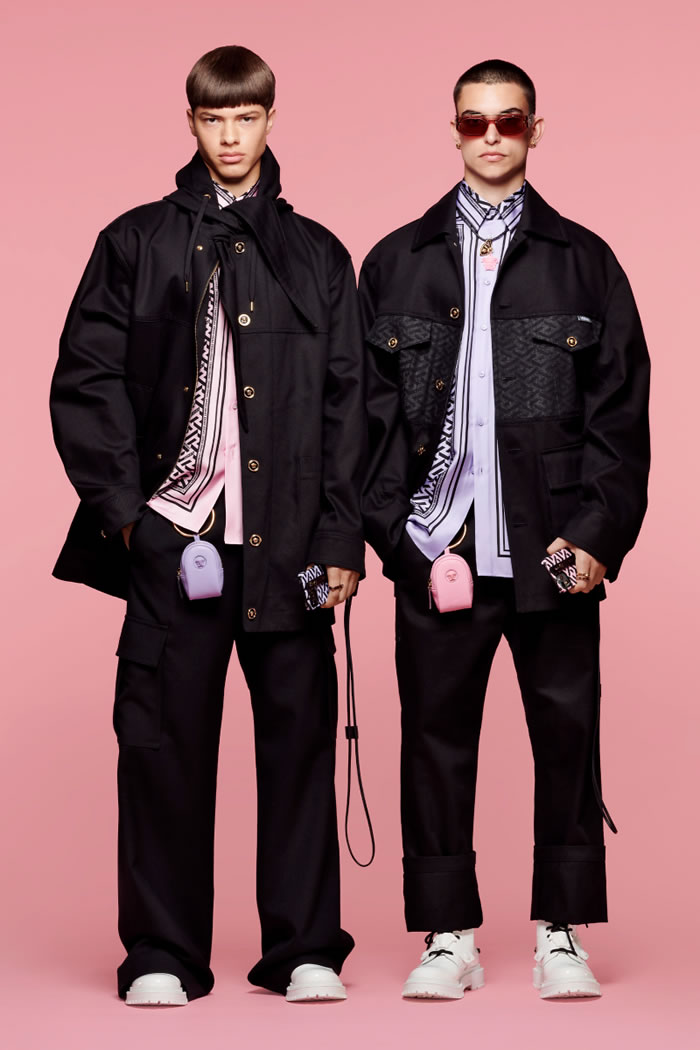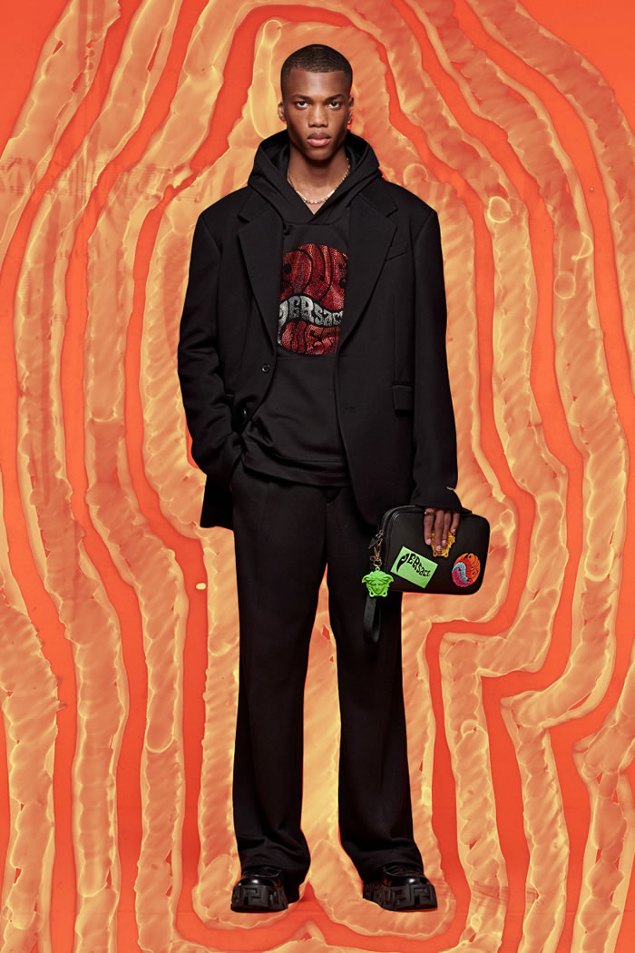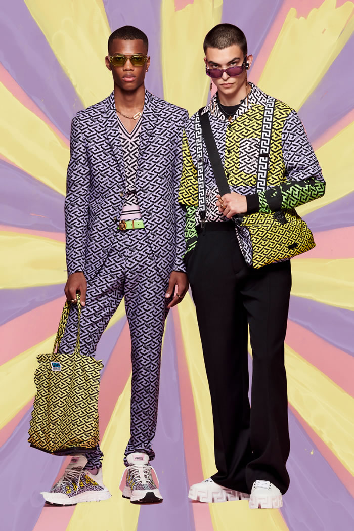 The lineup’s print extravaganza also included chain motifs used on draped silk dresses and plissé skirts, while the Greca monogram, which debuted with the fall 2021 show, made a comeback in new color variations on an array of items, from shirts and suits to windbreakers and accessories.