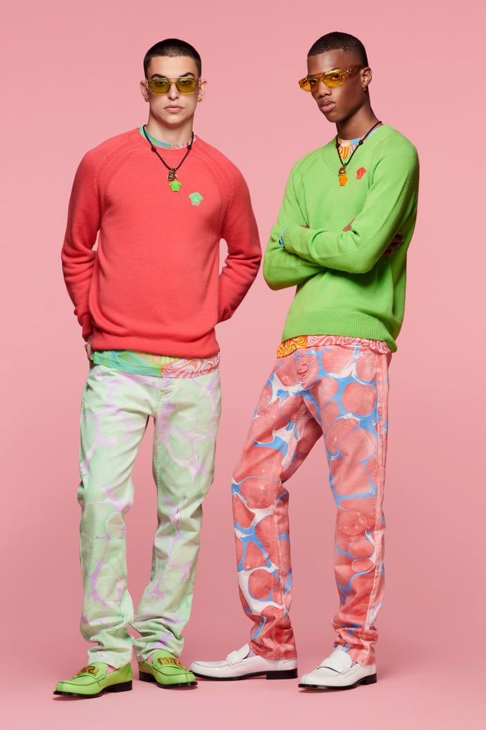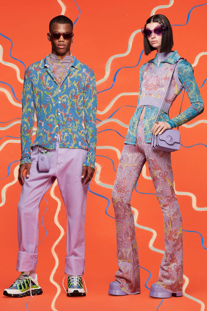 A trippy, swirling print, inspired by ’70s music posters, with the wording “Love.Versace.Medusa” rendered in bubbly fonts, was splashed on T-shirts tucked into A-lined miniskirts or on men’s plissé shirts and shorts. The same psychedelic vibe was infused into another pattern that peppered the marble-printed denim outfits.
