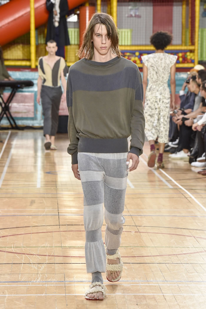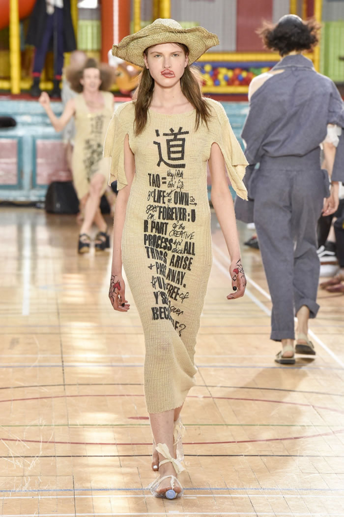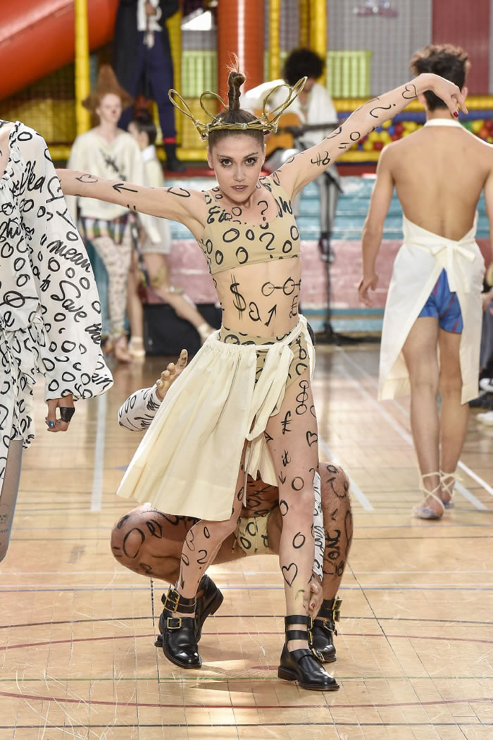 There were scribble and graffiti prints galore red hearts and diamonds, black clubs, dollar signs and question marks and scrappy silhouettes, too slashed sleeves on a cropped sweater, ragged patches on white trousers and flat sandals with soles made from crushed Evian bottles. Many of the models wore fishnets with crumpled and colorful bits of garbage stuffed into them and somehow that looked charming.