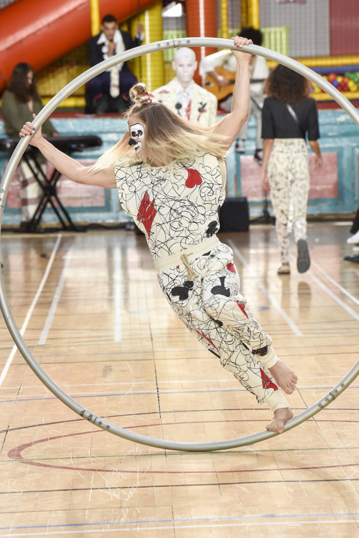 Acrobats, their faces painted like clowns, doubled as models, dancing and flipping and doing walking handstands up and down the gymnasium floor that served as a runway. The end of the world may be nigh, but for Westwood it’s clearly one big creative opportunity.
