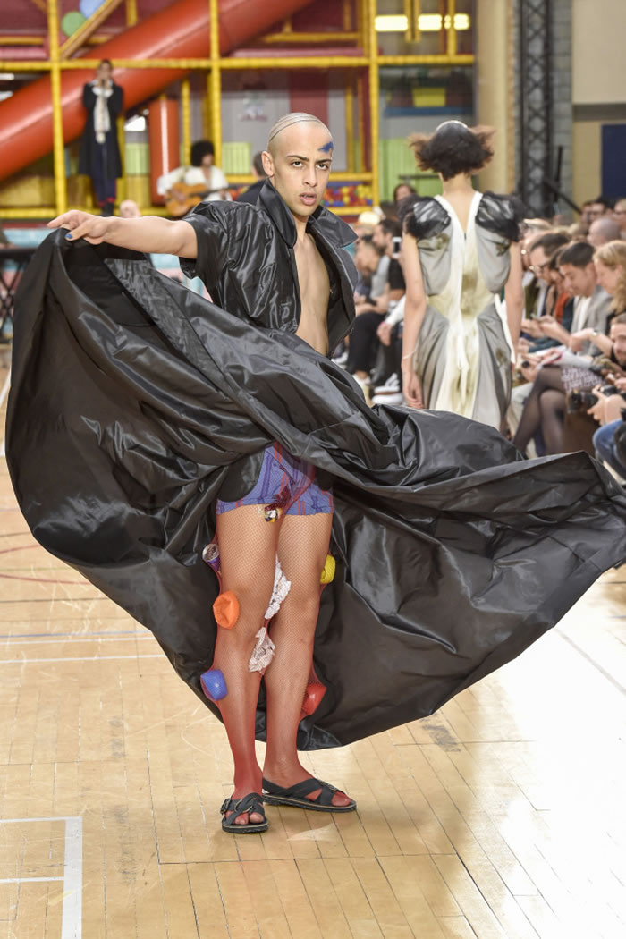 There were scribble and graffiti prints galore red hearts and diamonds, black clubs, dollar signs and question marks and scrappy silhouettes, too slashed sleeves on a cropped sweater, ragged patches on white trousers and flat sandals with soles made from crushed Evian bottles. Many of the models wore fishnets with crumpled and colorful bits of garbage stuffed into them and somehow that looked charming.