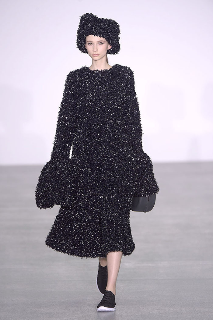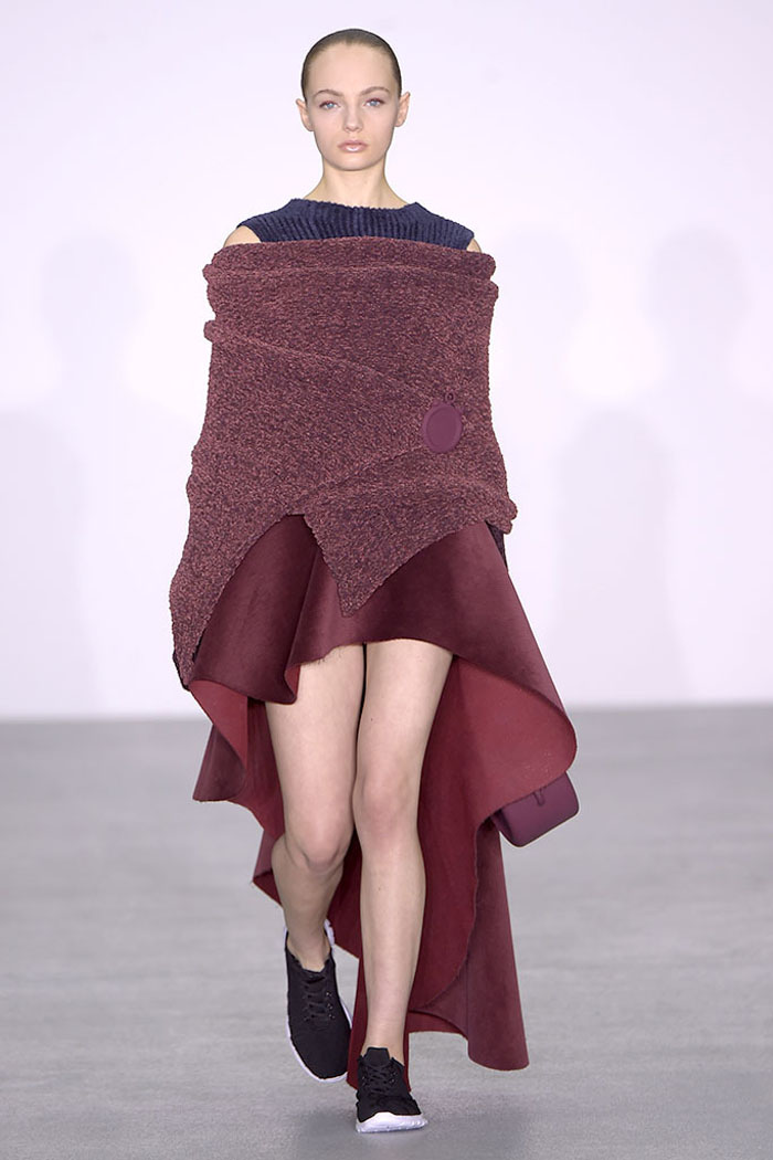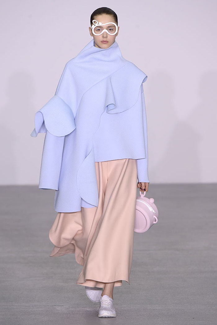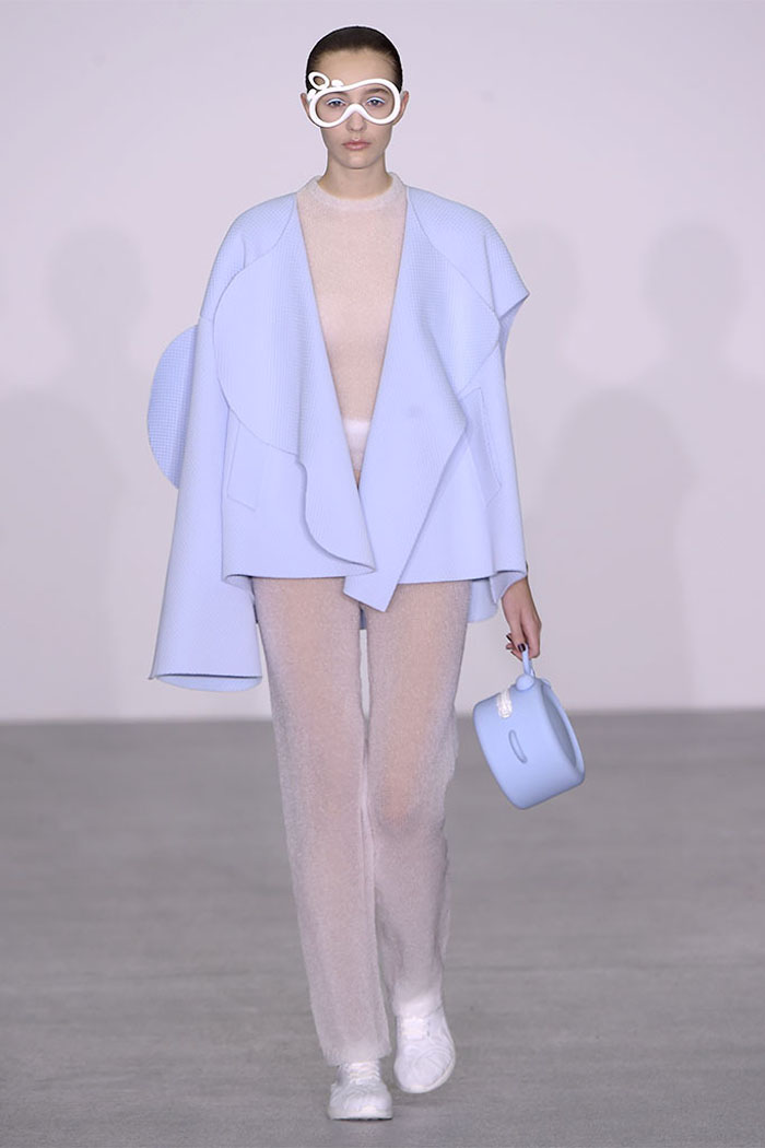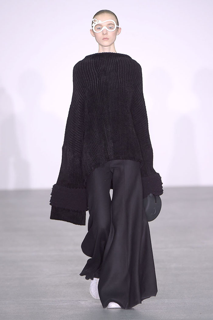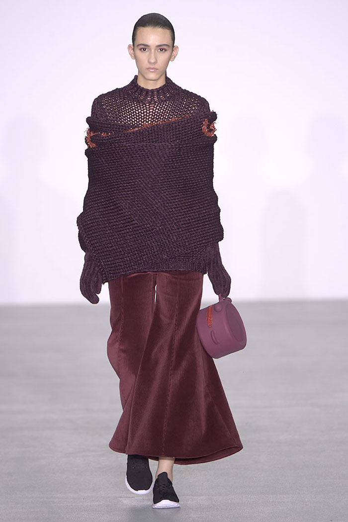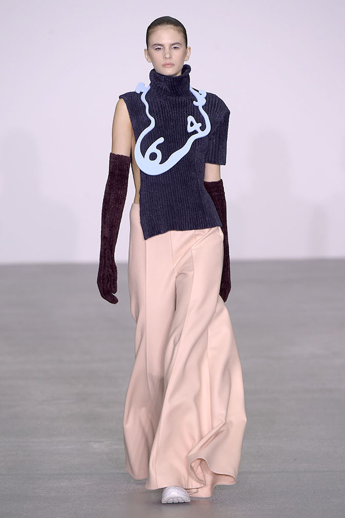 Xiao Li, who in November was named the Mercedes-Benz China Designer Award winner, is another London-based designer who is pondering the unrelenting pace of the fashion industry. Li, who’s making a name for her sculptural, inventive knitwear, said in her show notes that she wanted to address “the feeling that there is no time for young designers to incubate and develop their ideas.”