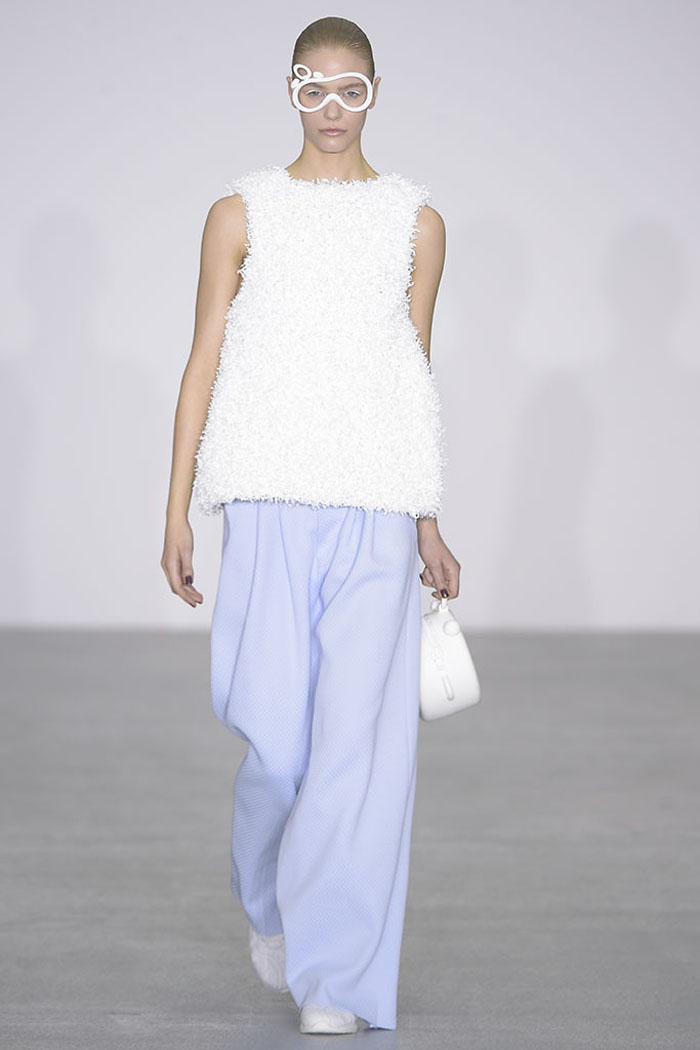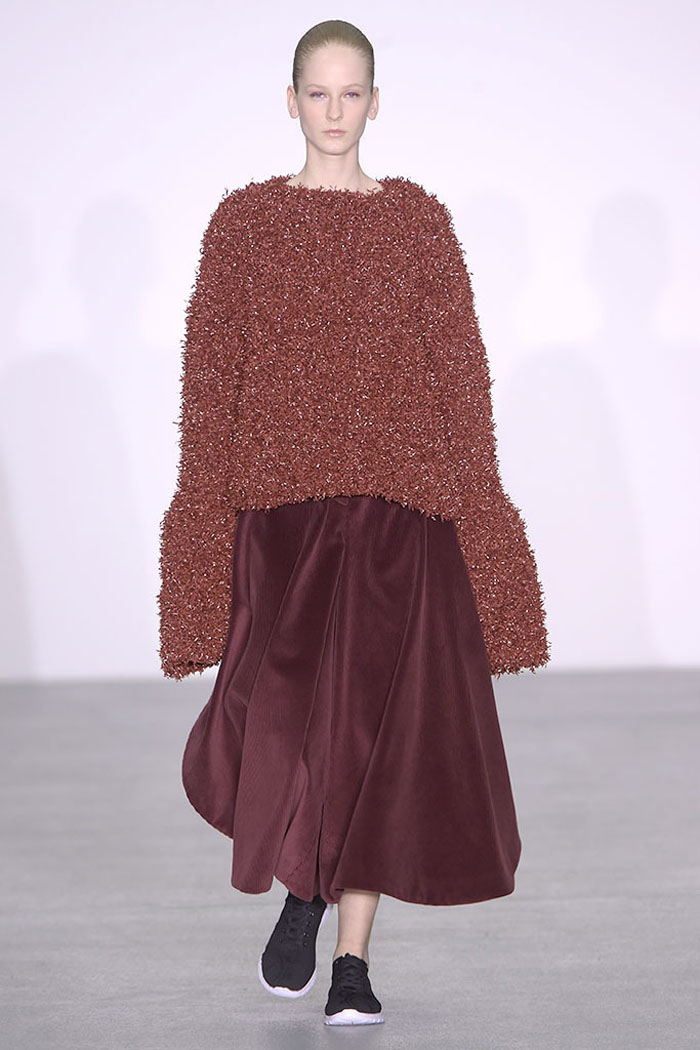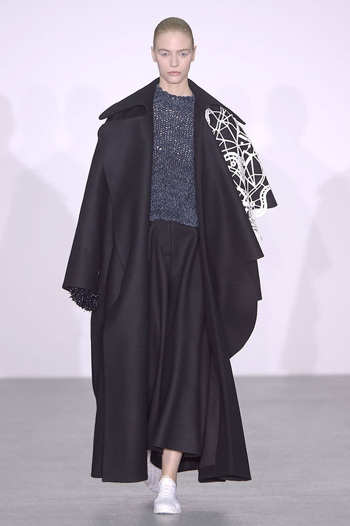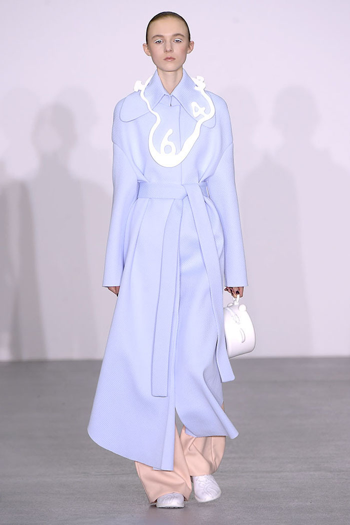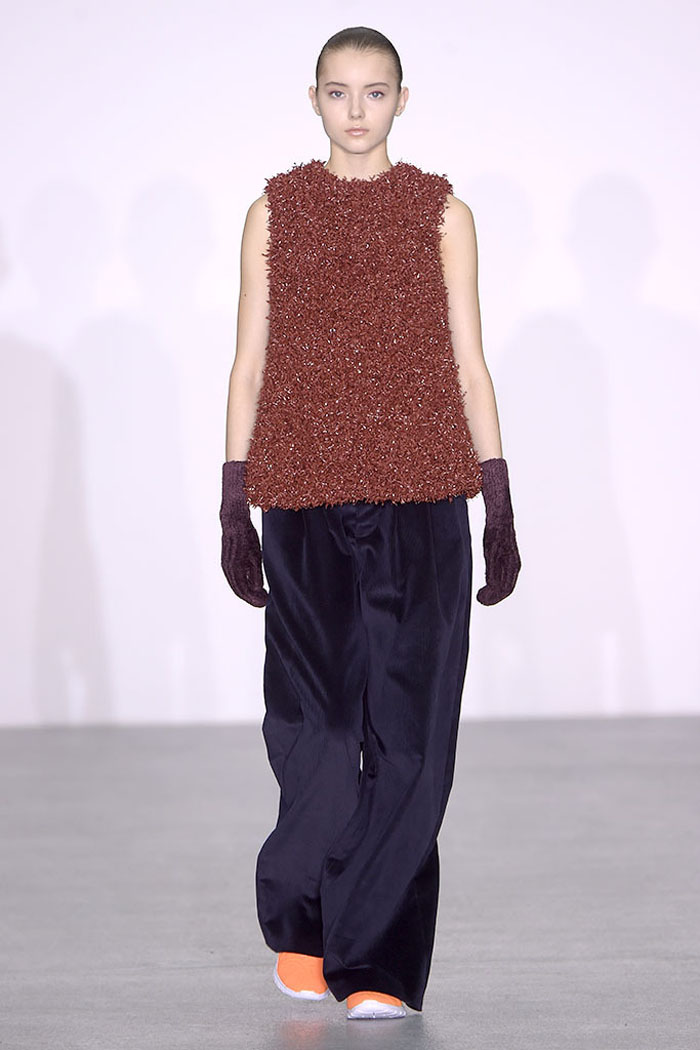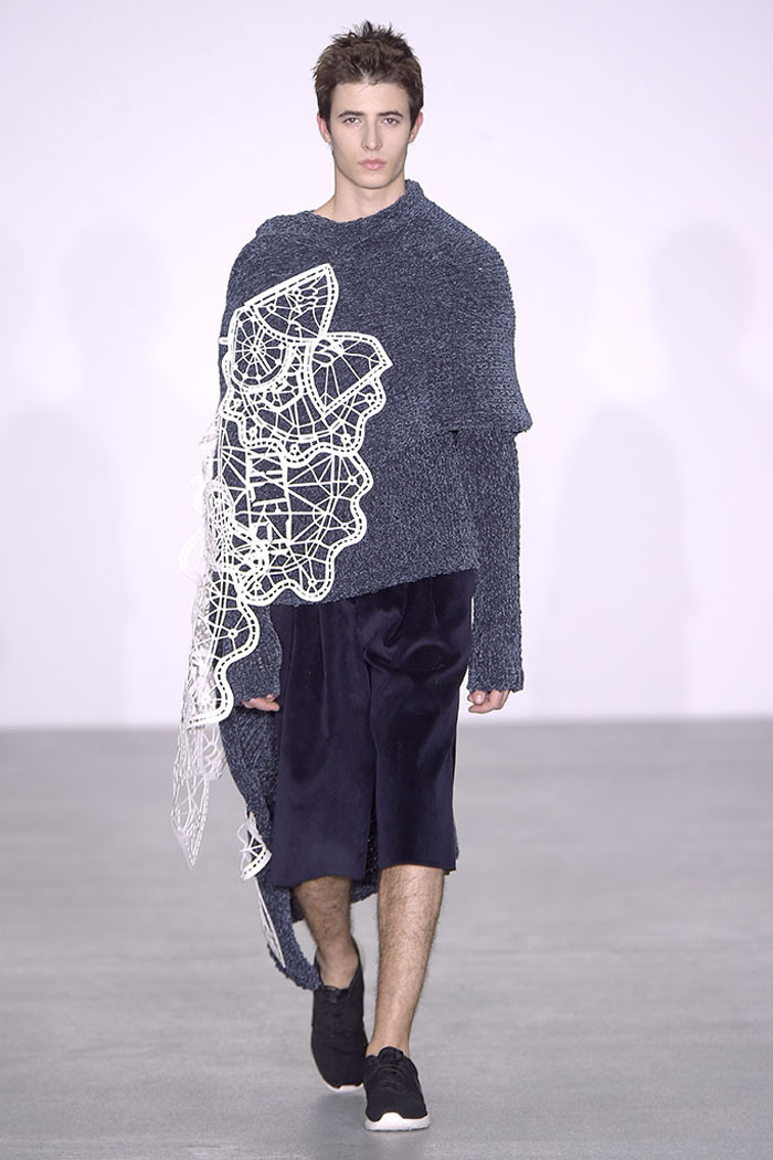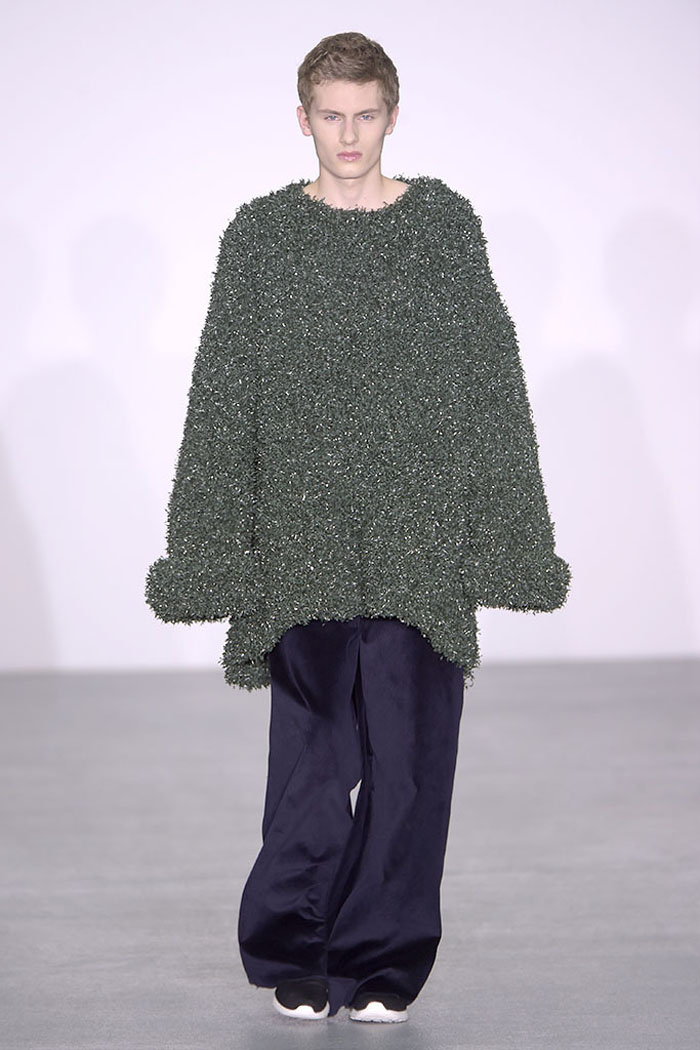 Xiao Li, who in November was named the Mercedes-Benz China Designer Award winner, is another London-based designer who is pondering the unrelenting pace of the fashion industry. Li, who’s making a name for her sculptural, inventive knitwear, said in her show notes that she wanted to address “the feeling that there is no time for young designers to incubate and develop their ideas.”