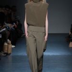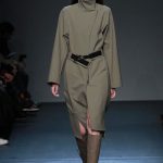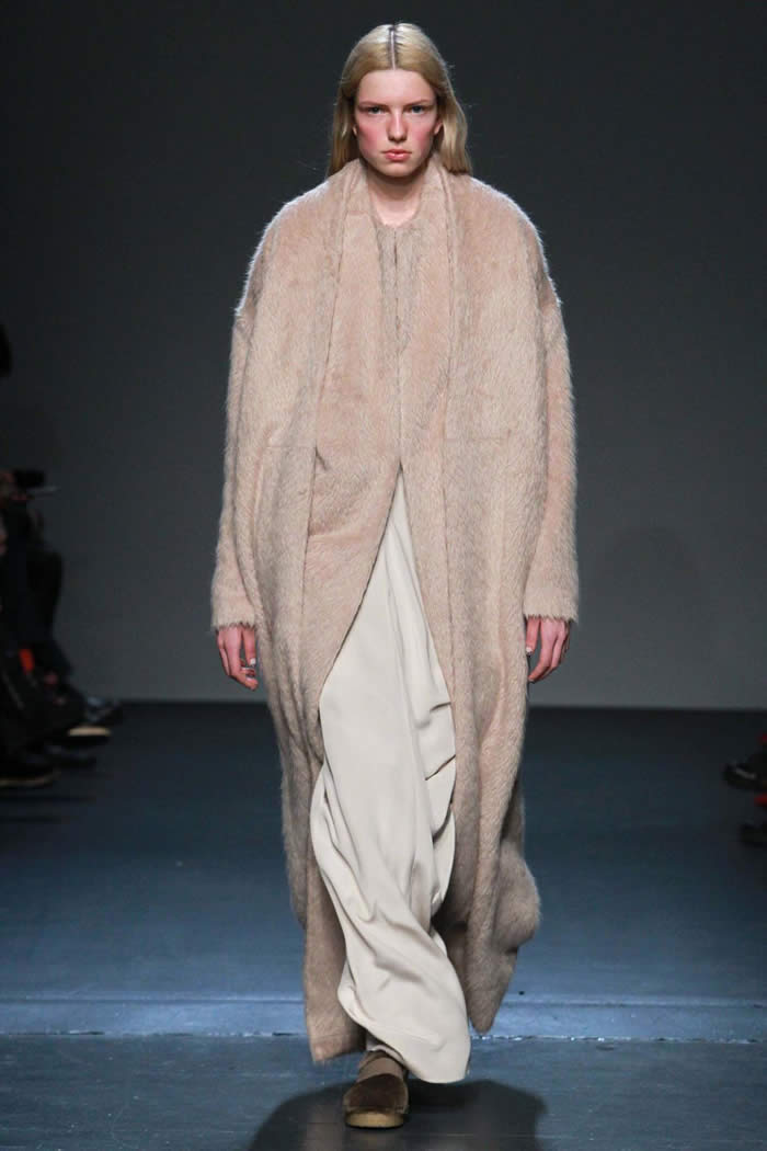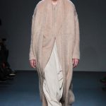 Even with all the easy shapes, split-level proportions and layering, Cornejo kept a light hand. That touch was evident in her slender skirts wrapped over pants or jumpsuits and a plush shearling jacket paired with lean pants. Among her many relaxed, ankle-grazing dresses, the pale pink silk crepe version shown with a matching alpaca and wool long robe coat was the loveliest. Once again, Cornejo managed to make even her simplest silhouettes interesting, whether via inventive cutting and draping, rich texture and color combinations, or just because her clothes never look like anyone else’s.