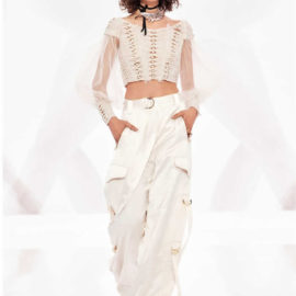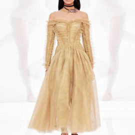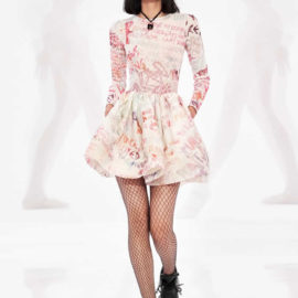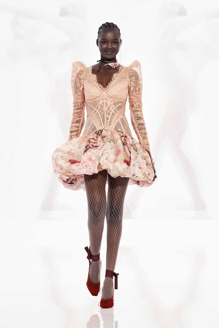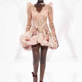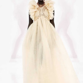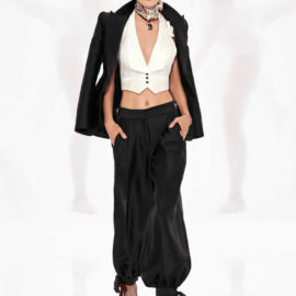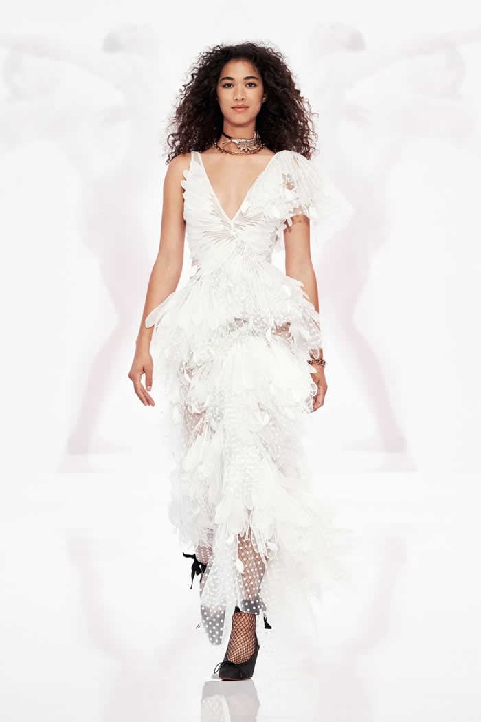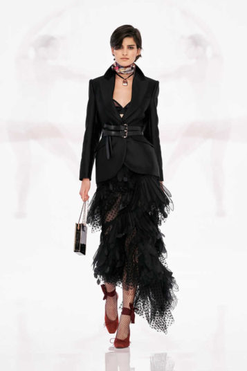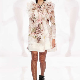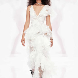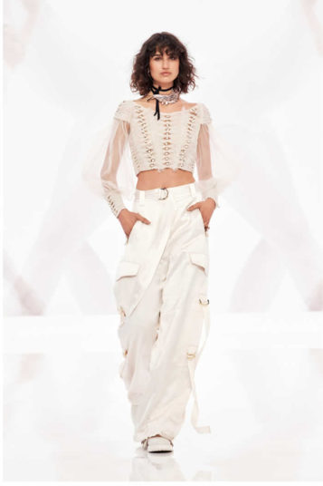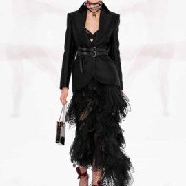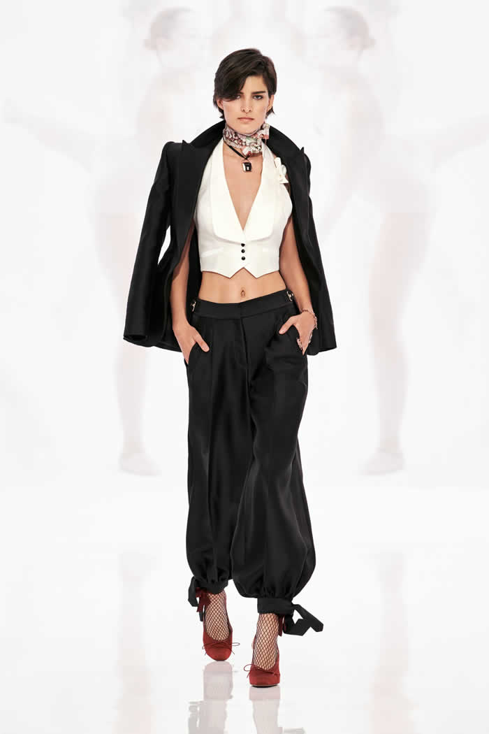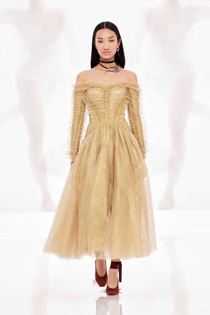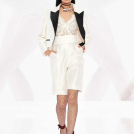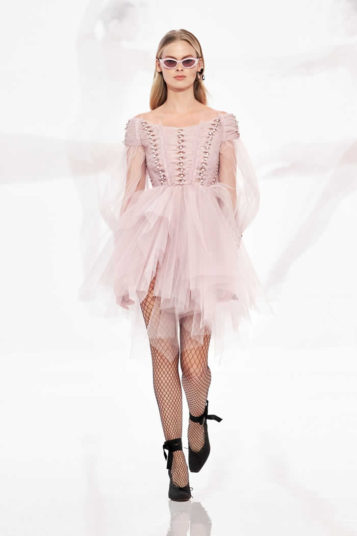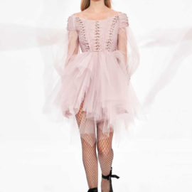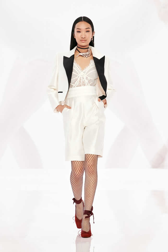 Liquid metallic (or cream) training pants in weighty viscose were paired with intricate and elaborate tulle tops (some of which incorporated intertwined pearl and hardware details); feminine frocks were toughened up with fishnets and combat boots, and lingerie and corsetry tops and dresses contrasted sleek tailored styles.