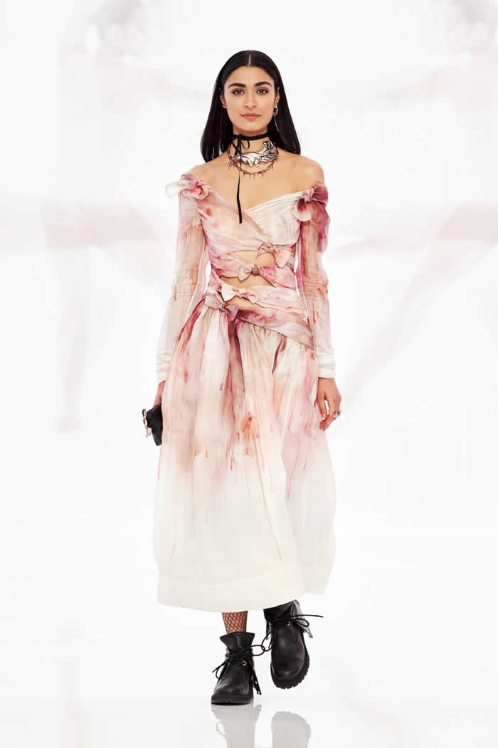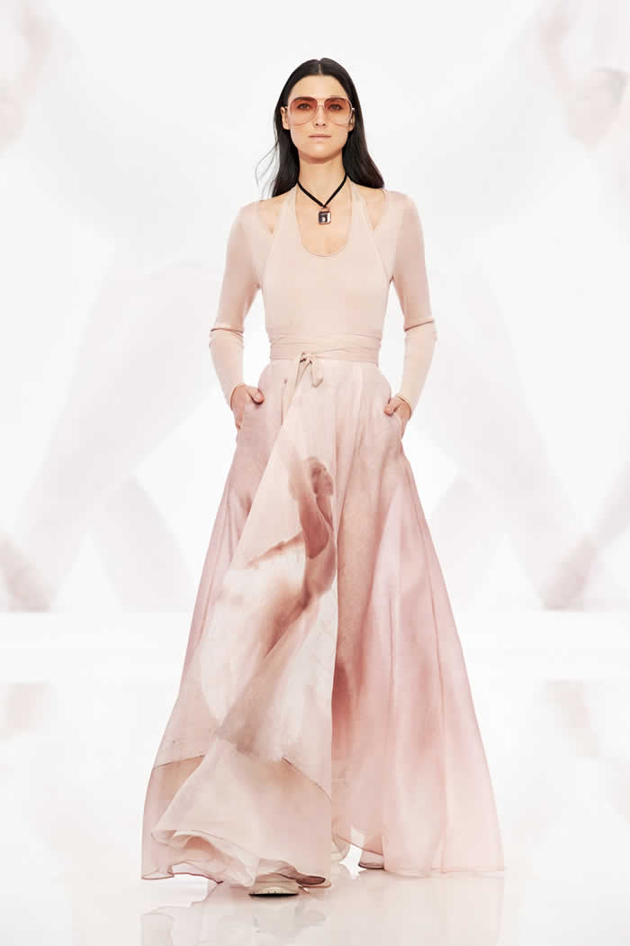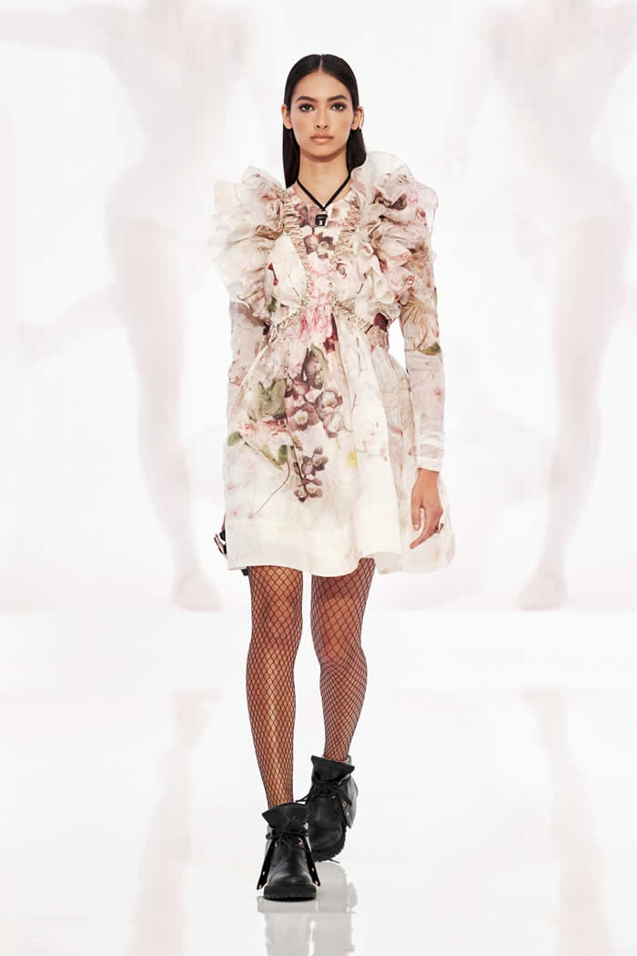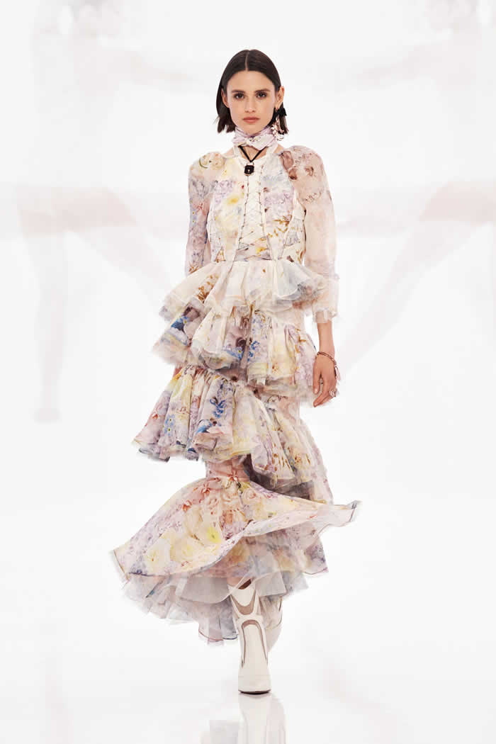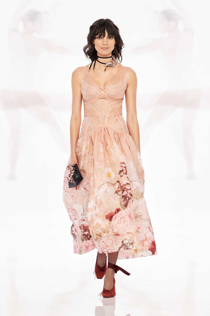 Their elegance and fluidity of movement inspired floaty silhouettes while an uptick of city-appropriate garments played to off-duty looks. The collection upheld the feminine, playful spirit upon which Zimmermann built her label (like a blush wrap-top with a long, ethereal skirt with ballet dancer splashed across, or pretty, printed dresses with voluminous, tiered layers and sleeves and laser-cut petals), but spring also offered a more edgy look.