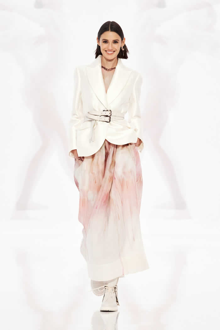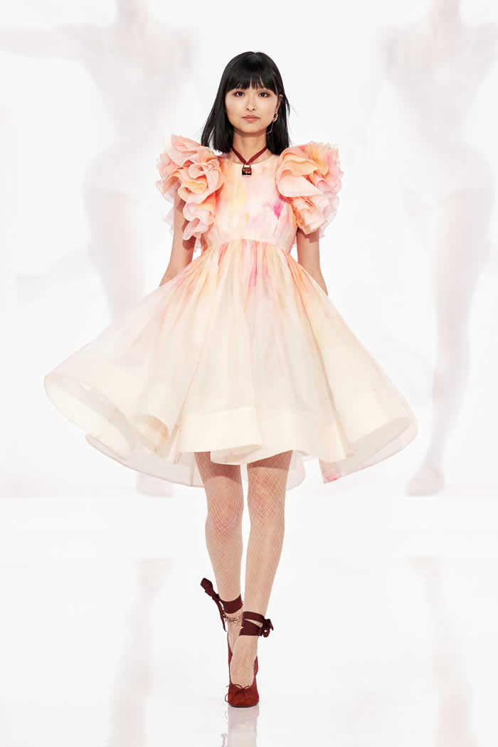Their elegance and fluidity of movement inspired floaty silhouettes while an uptick of city-appropriate garments played to off-duty looks. The collection upheld the feminine, playful spirit upon which Zimmermann built her label (like a blush wrap-top with a long, ethereal skirt with ballet dancer splashed across, or pretty, printed dresses with voluminous, tiered layers and sleeves and laser-cut petals), but spring also offered a more edgy look.