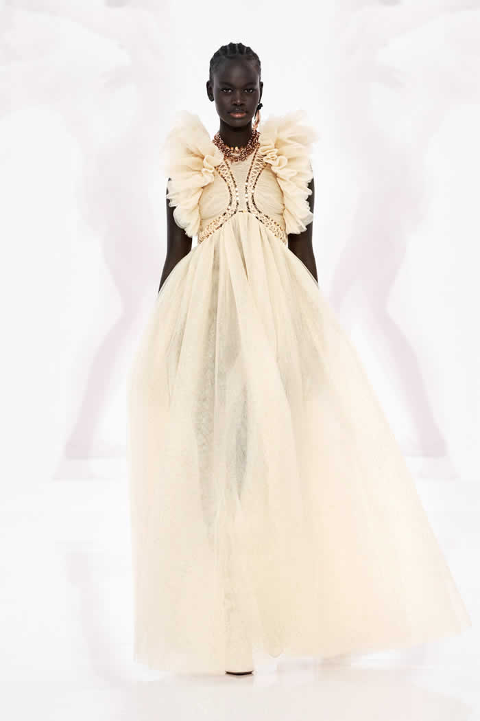 Liquid metallic (or cream) training pants in weighty viscose were paired with intricate and elaborate tulle tops (some of which incorporated intertwined pearl and hardware details); feminine frocks were toughened up with fishnets and combat boots, and lingerie and corsetry tops and dresses contrasted sleek tailored styles.