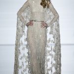 Among the false notes was a pink ball gown that paired a barely there sleeveless bodice with a skirt made of yards of tulle that shimmered like mother-of-pearl. His quieter looks were among the finest — including a sheer column dress in vintage-feel bronze lace with a waterfall cape. And as the bride emerged,Murad’s sleek catwalk reflected her mirror image as clearly as a lake.