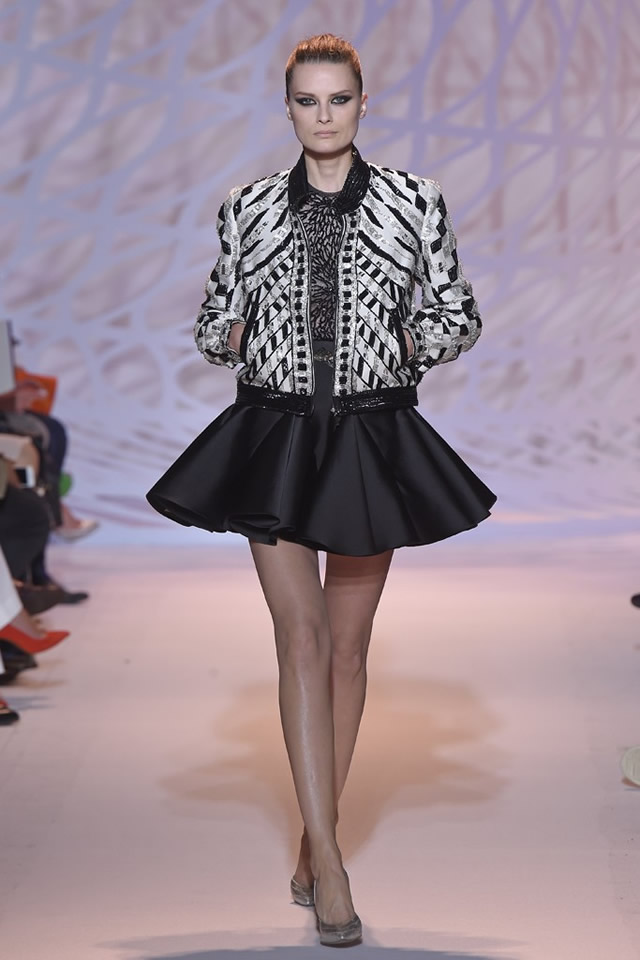 The Lebanese designer used black and white to great effect, whether on a draped bustier gown that was neatly split in half for a yin-and-yang effect, or on a bomber jacket embroidered with an abstract checkerboard pattern worn over a stiff black skater skirt.