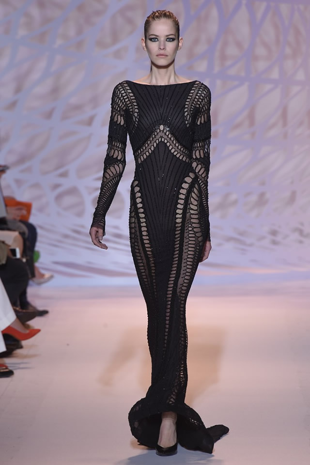 Zuhair Murad used graphic tone-on-tone embroideries to create peekaboo effects on column dresses in his signature sheer fabrics.