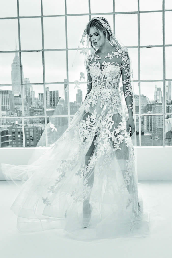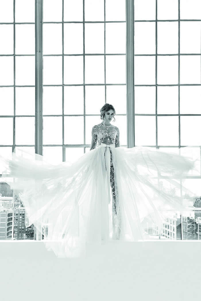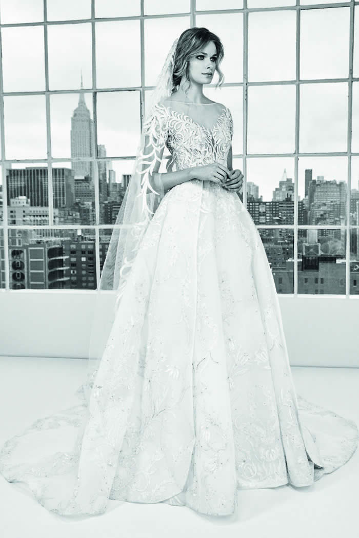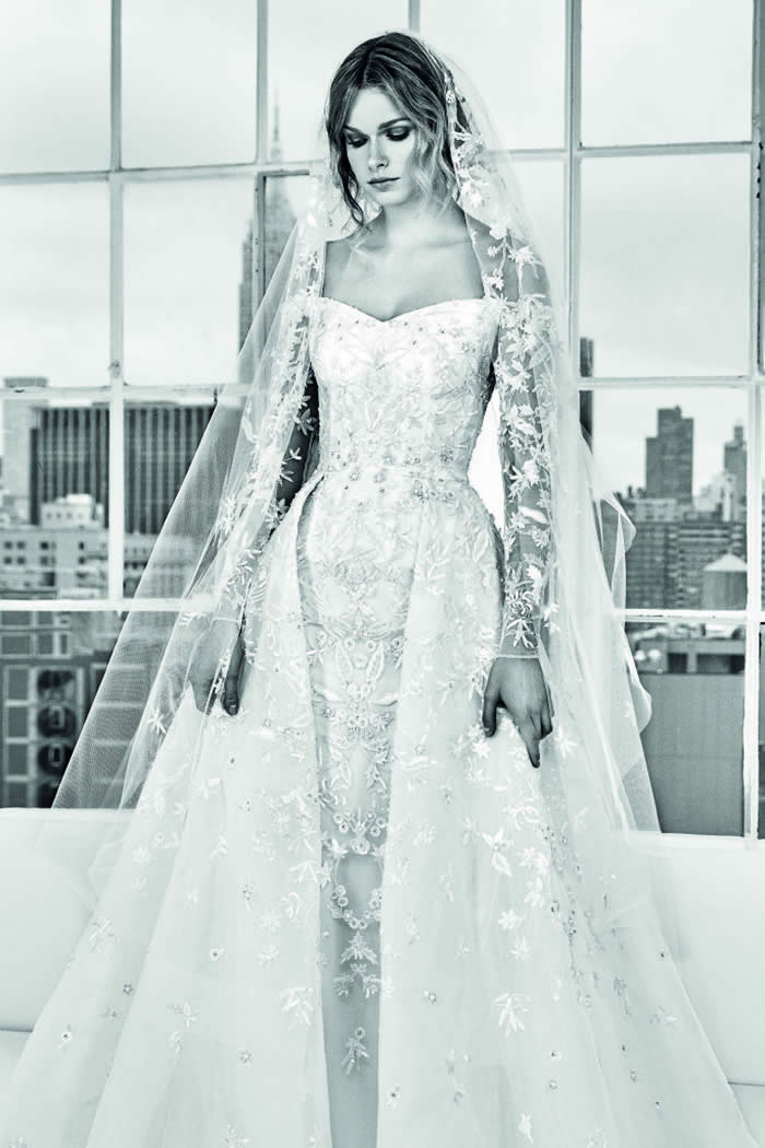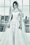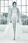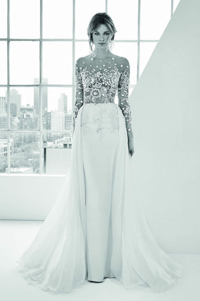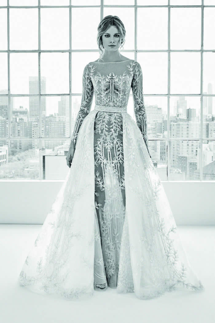 Zuhair Murad knows how to make a beautifully ornate dress, showing in his latest bridal offering the type of lavish embroidery and sensuality found in his other collections. He was inspired this season by the Jardim Botanico in Rio de Janeiro, working in themes of lush gardens, florals and imaginary birds via tulle and chiffon confections, crystal and pearl embroideries, and a romantic lightness in silhouettes. There was a sense of daring with the introduction of a hand-beaded body-hugging jumpsuit, styled with a voluminous removable overskirt with the magical effect of elevating any slim gown.