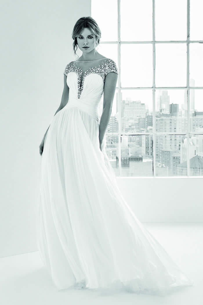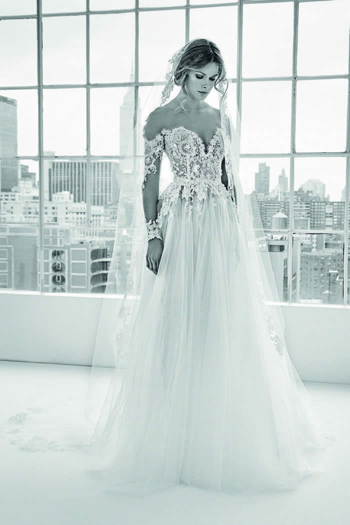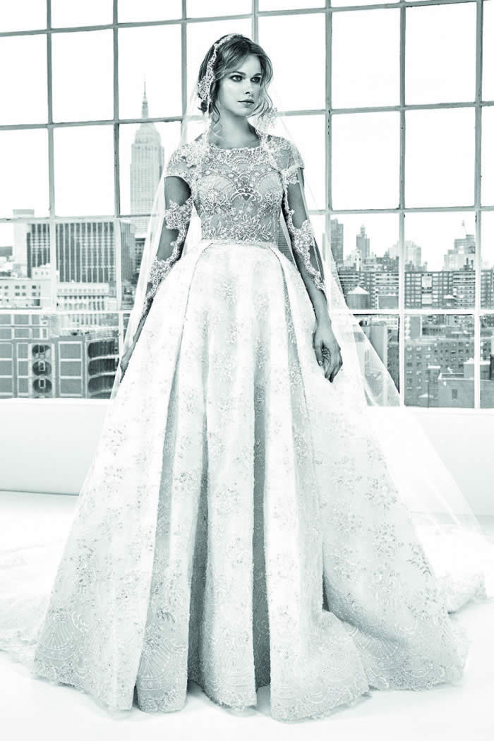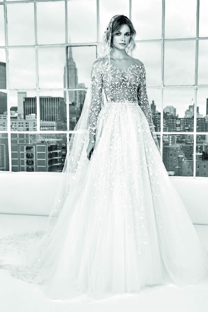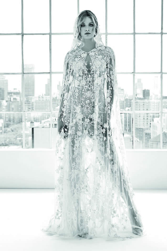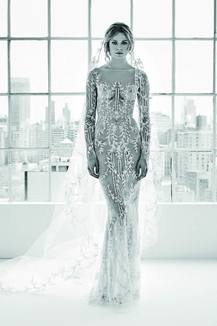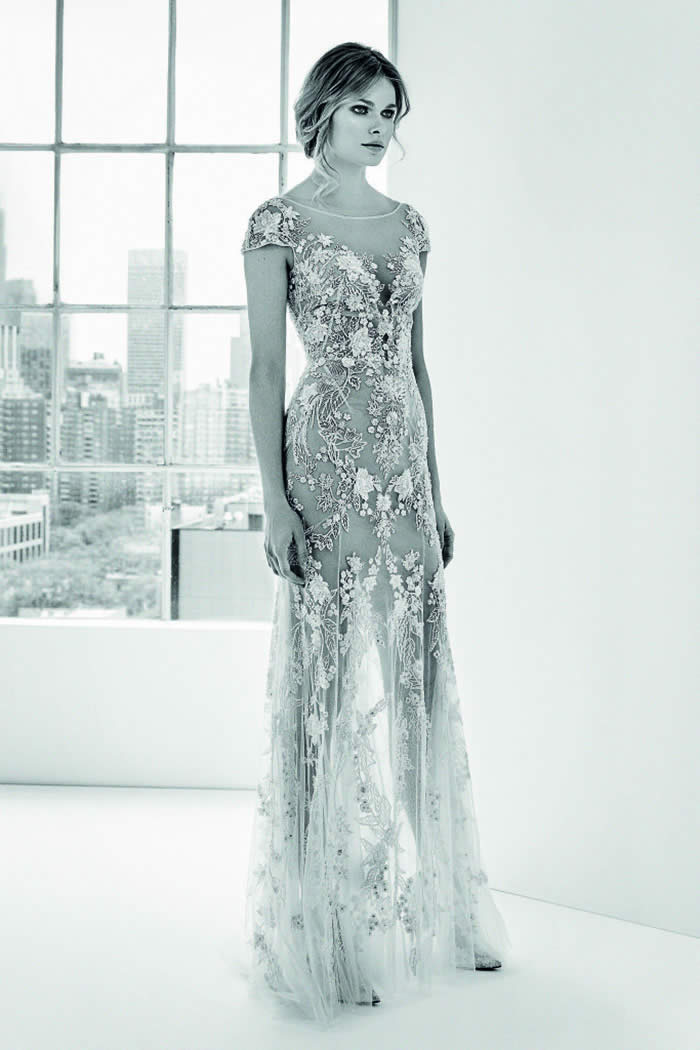 Zuhair Murad knows how to make a beautifully ornate dress, showing in his latest bridal offering the type of lavish embroidery and sensuality found in his other collections. He was inspired this season by the Jardim Botanico in Rio de Janeiro, working in themes of lush gardens, florals and imaginary birds via tulle and chiffon confections, crystal and pearl embroideries, and a romantic lightness in silhouettes. There was a sense of daring with the introduction of a hand-beaded body-hugging jumpsuit, styled with a voluminous removable overskirt with the magical effect of elevating any slim gown.